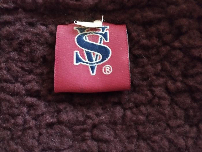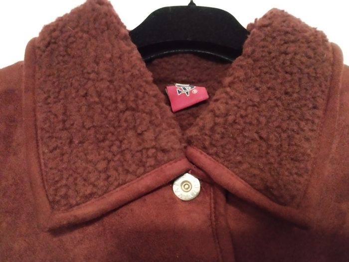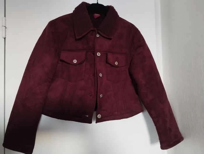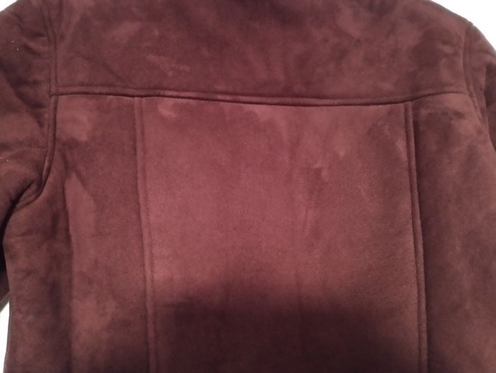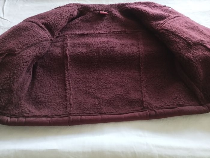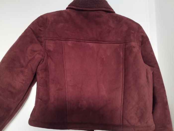 Blouson court neuf jamais porté, épais, manches et intérieur fourré. Aspect daim doux et chaud.Taille S Couleur bordeaux. Largeur épaules 42cm Hauteur 50cm.