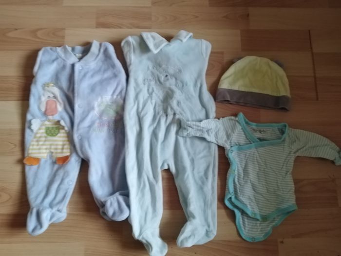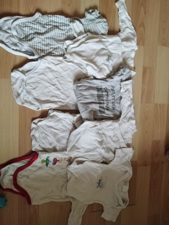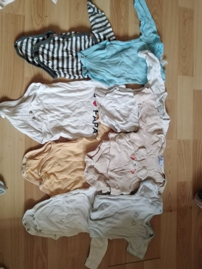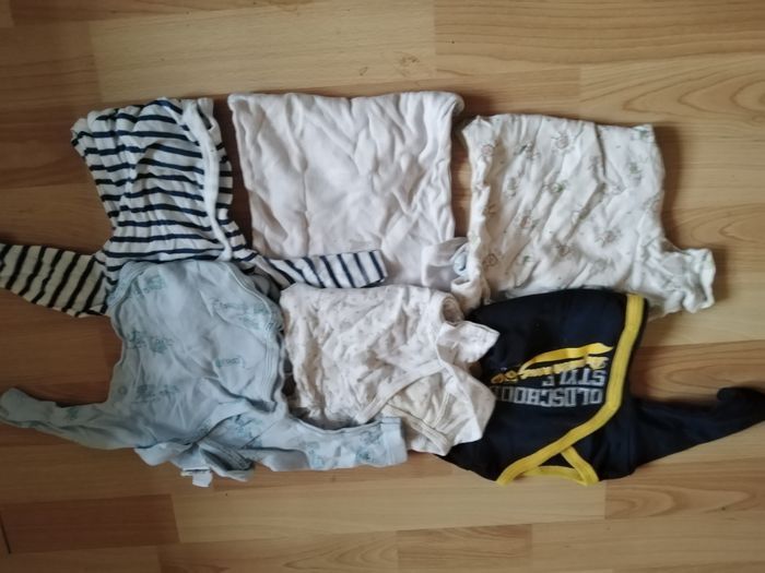 4 pantalons 23 bodys manche courtes et longues 6 tee-shirt 1 salopette 5 combinaison 1 bonnet 1 veste (en laine) Taille diverses (0/1/3/6 mois) (un petit body tâché)