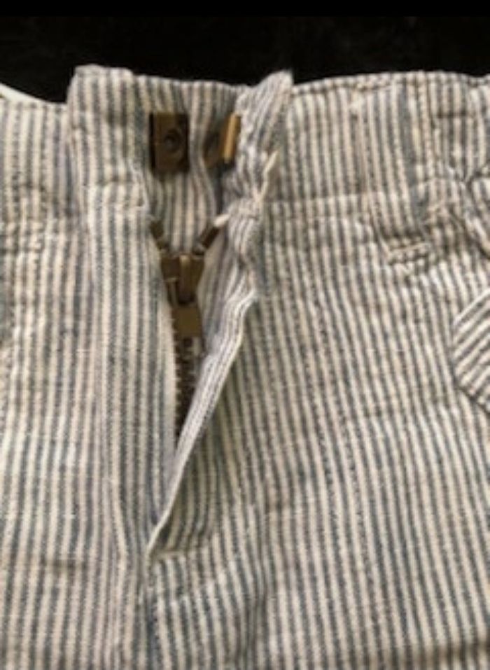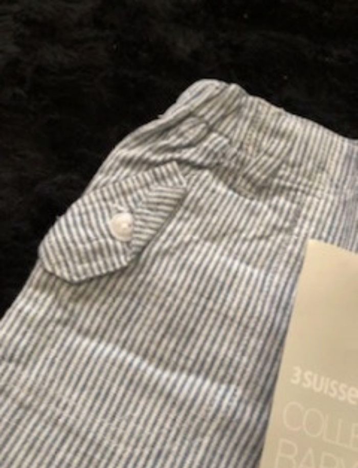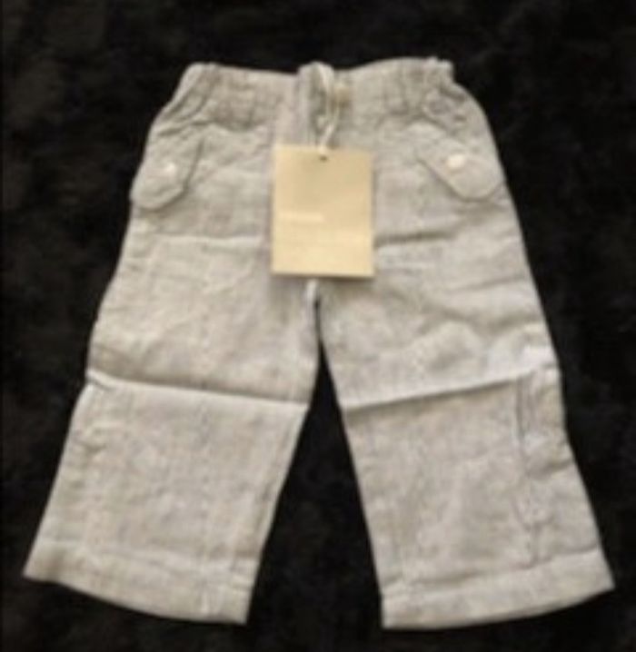 Pantalon retroussable grâce aux pattes de boutonnage sur les côtés. Ceinture à passants fermée par zip et agrafe devant. Ceinture intérieure élastiquée réglable par boutons pour un ajustement parfait à la taille. 2 poches en biais devant, fermées par un rabat boutonné. 2 poches plaquées et boutonnées au dos. Toile 55% lin, 45% coton. Coloris : rayé/blanc Taille : 18 mois Prix : 9 € #sisterkayagarçon18mois Neuf jamais porté