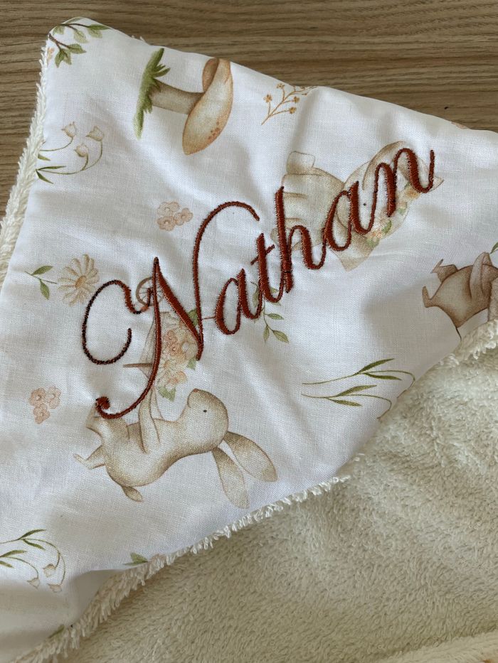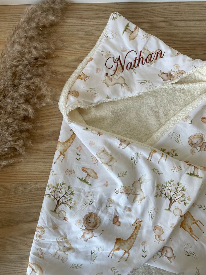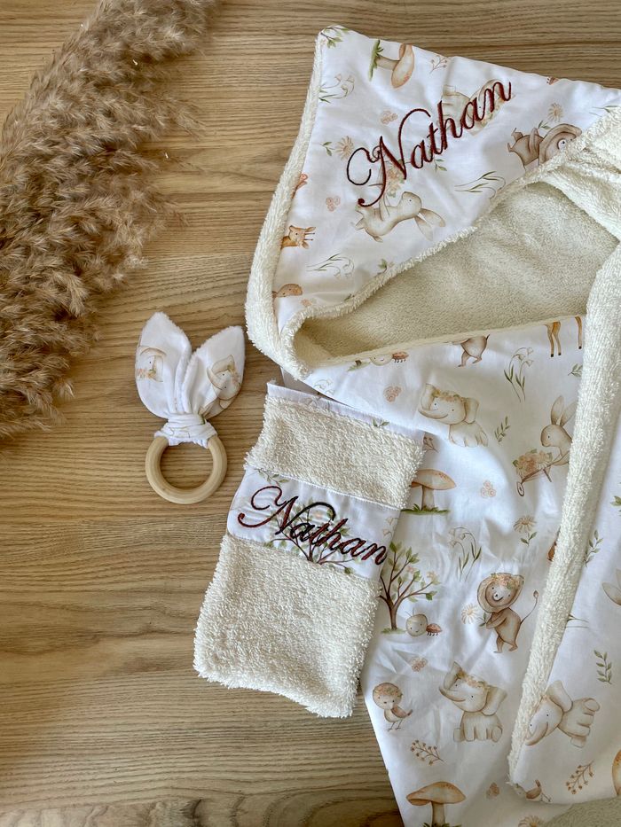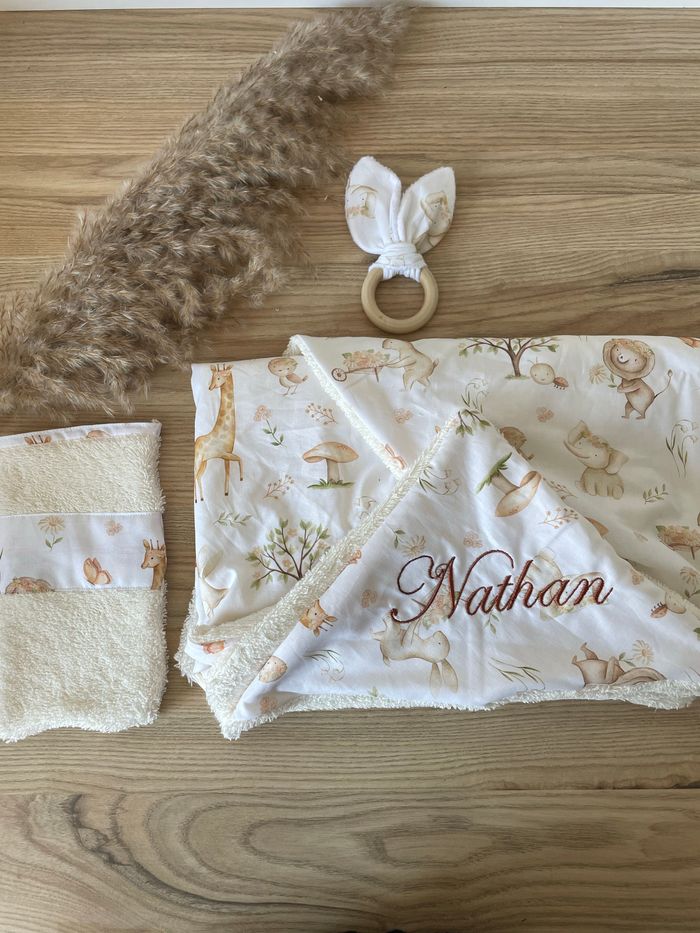 Voici une Box cadeau de naissance bain. Vous y trouverez une cape de bain avec capuche, un gant de toilette et un hochet. La serviette et le gant seront broder au nom/surnom de votre choix. La Box est disponible dans d’autres tissus. N’hésitez pas à m’envoyer un message pour toute question. Retrouvez mes créations sur Instagram @lalayettedechloe