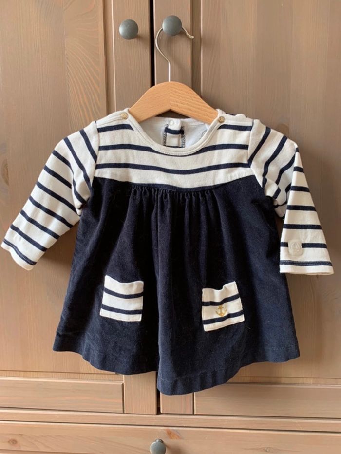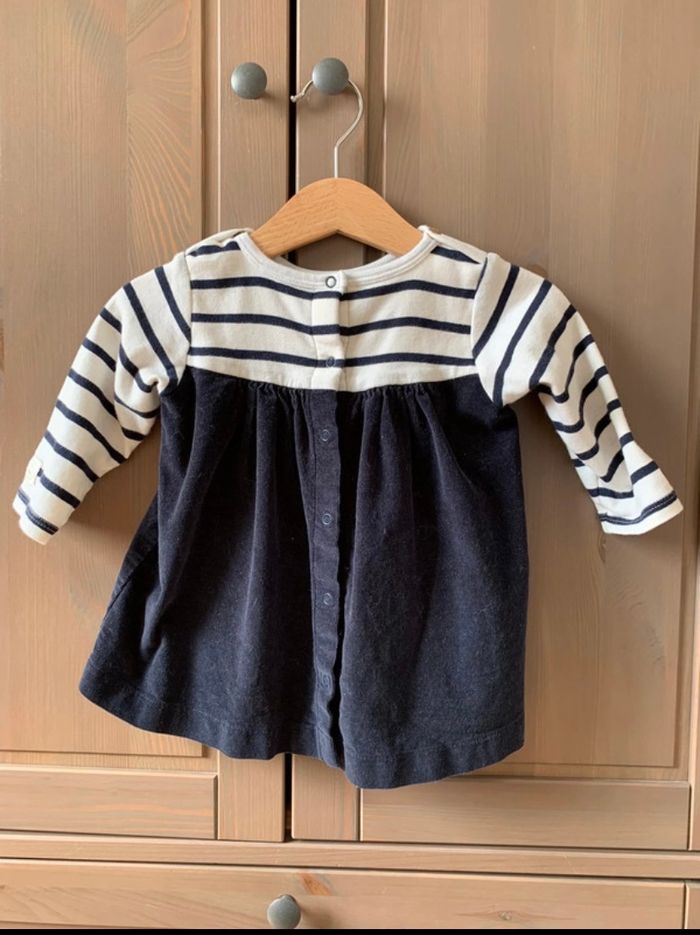 Robe manches longues Le bas est en velours bleu et le haut est en coton Taille 6 mois/67 cm Fermeture boutons pression à l’arrière