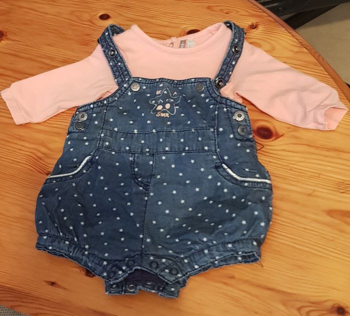 Salopette et son t-shirt a manches longues Très bon état L'ombre que l'on voit sur la photo n'est pas une tâche mais une ombre du a la photo