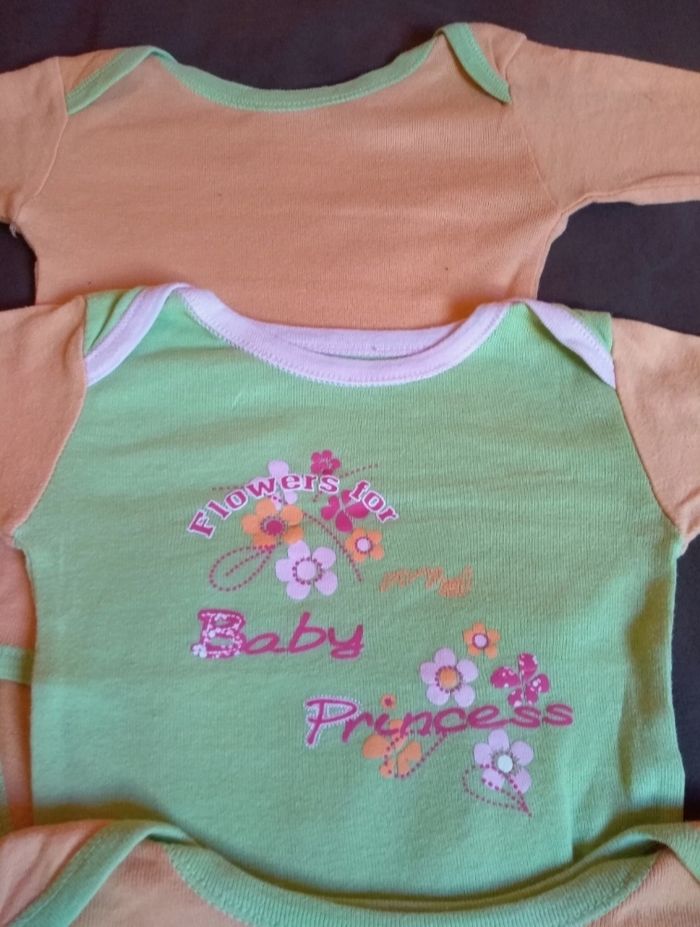 lot de 3 bodies manches longues très colorés / 18 mois 100% coton 1 bodie orange uni avec liseré vert 1 bodie vert avec motif 1 bodie orange avec motif