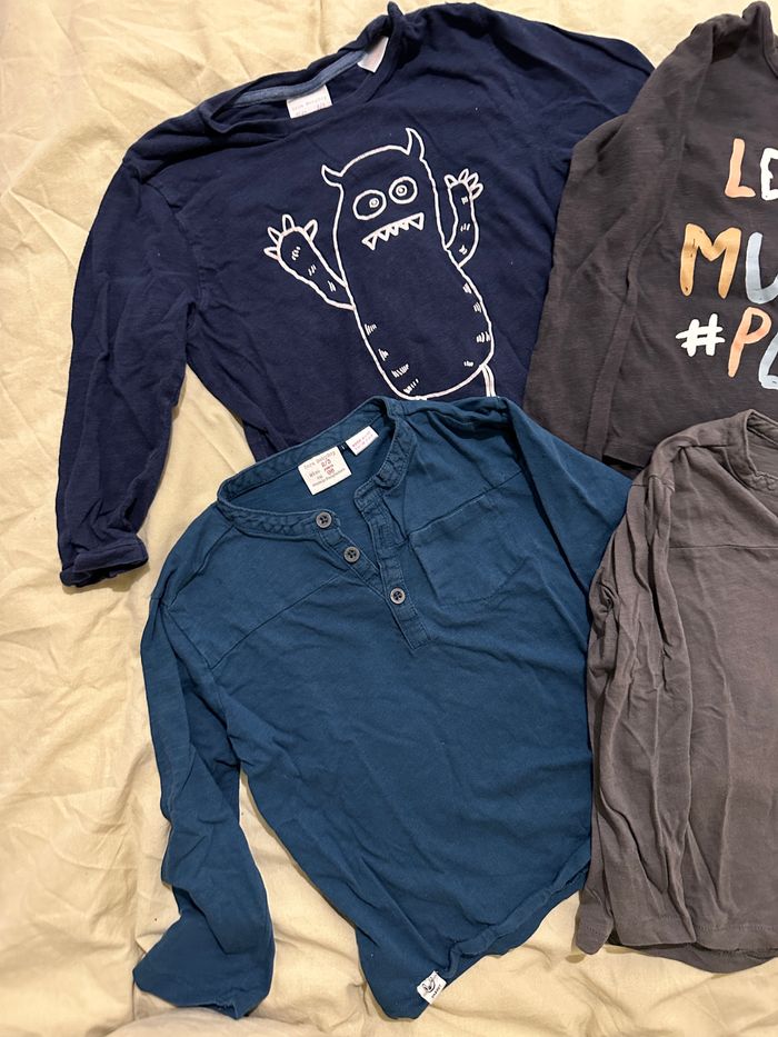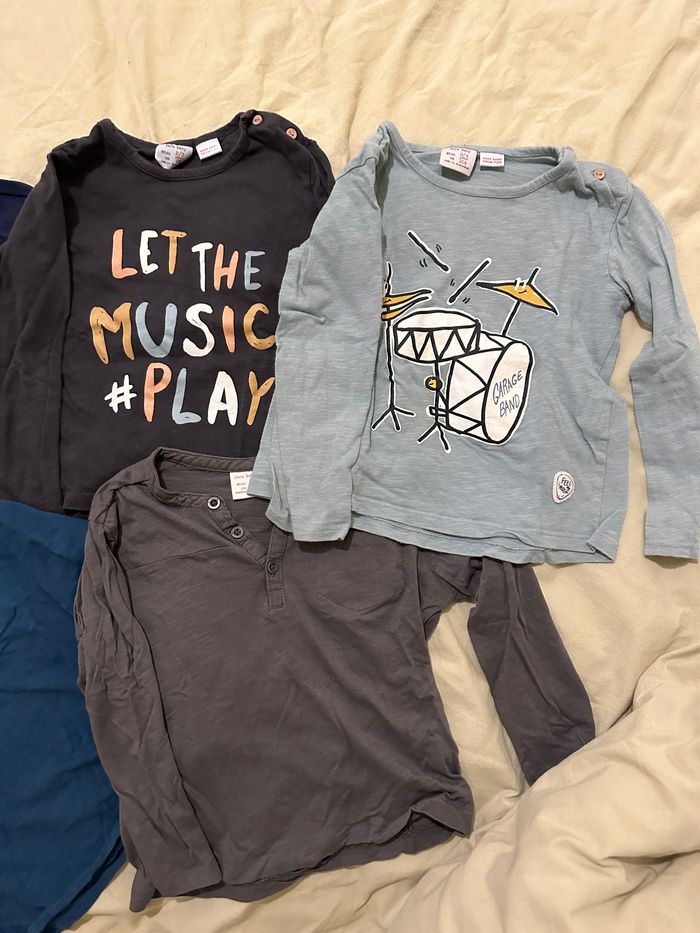 Lot de cinq T-shirts manches longues, tous de marque Zara, en taille 2/3 ans sauf le T-shirt bleu ciel avec le dessin de batterie qui est en taille 3/4ans