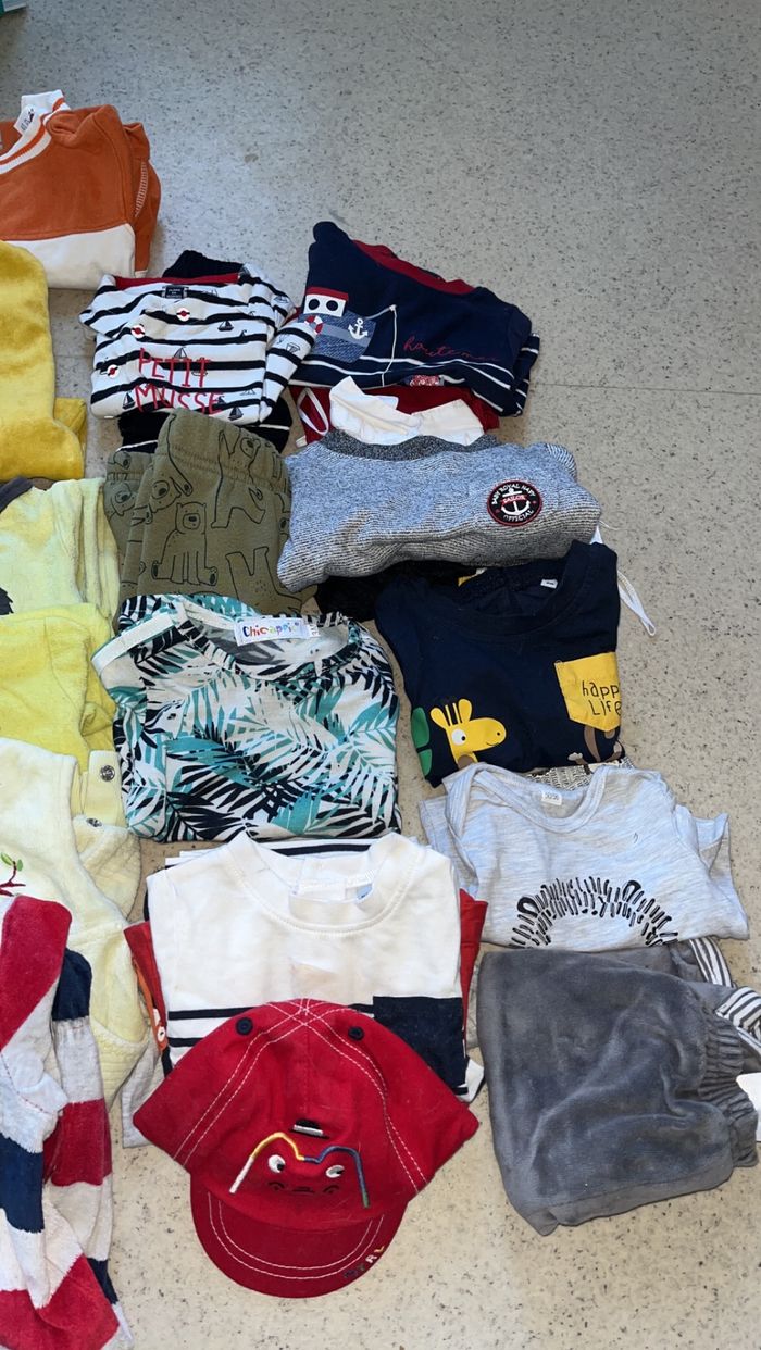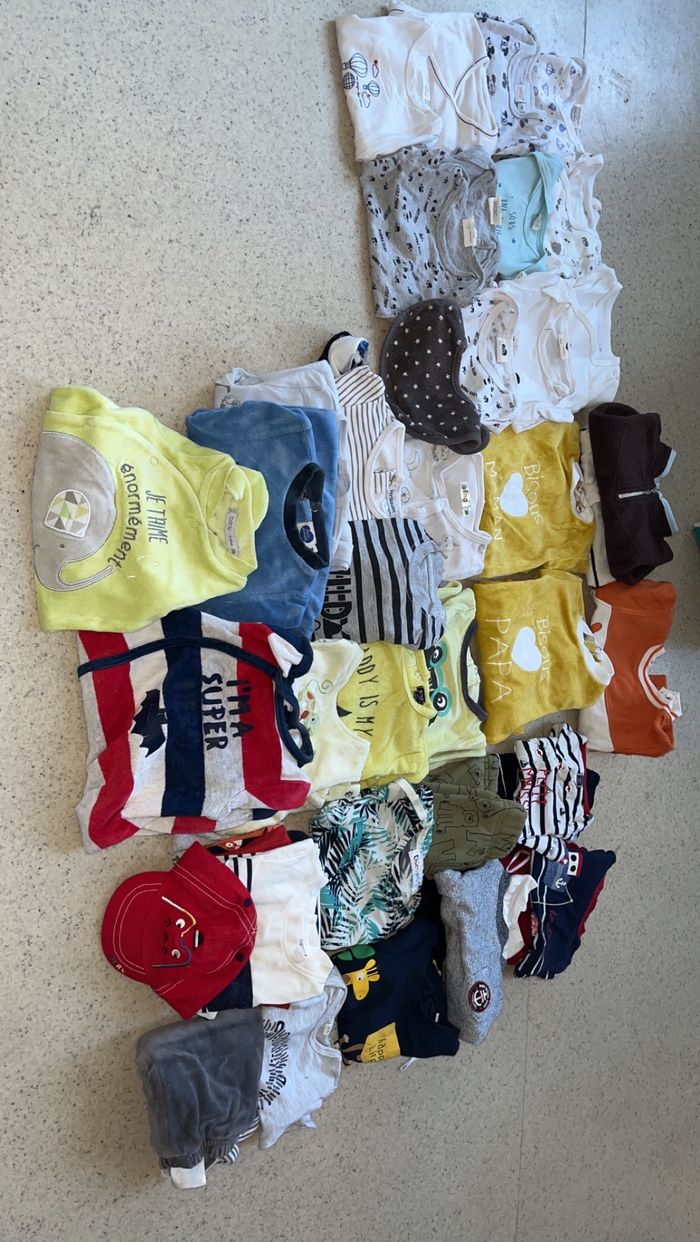 2 bodies manches courtes 9 bodies manches longues 1 bavoir 1 paire de chaussettes 2 gilets 12 pyjamas 1 combie short 3 ensemble short t-shirt 1 pantalon pyjama 1 pantalon 2 ensemble pull pantalon 4 t-shirt 1 t-shirt manche longue 1 casquette