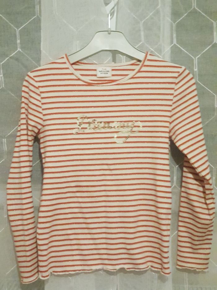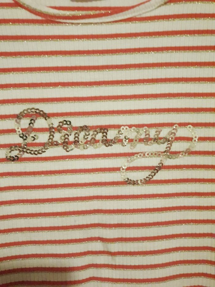 Vendre sous pulls blanc avec rayure orange et dore et une écriture au milieu avec strass