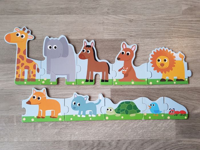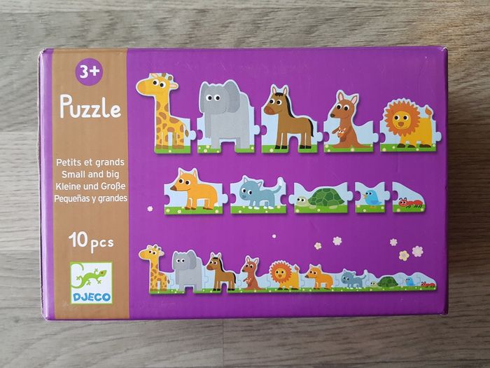 Puzzle animaux DJECO, 10 pièces, complet. Il faut placer les animaux du plus petit au plus grand. Certaines pièces sont légèrement abîmées.