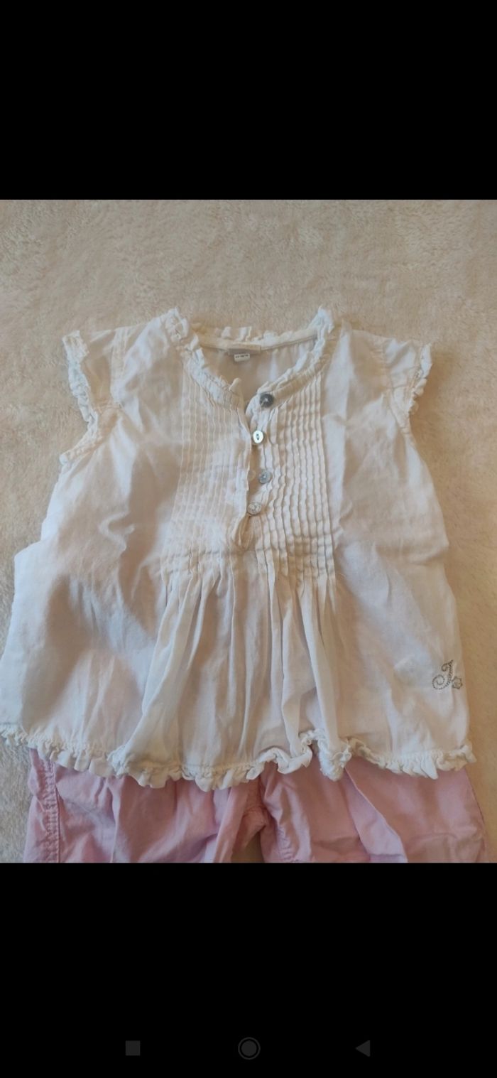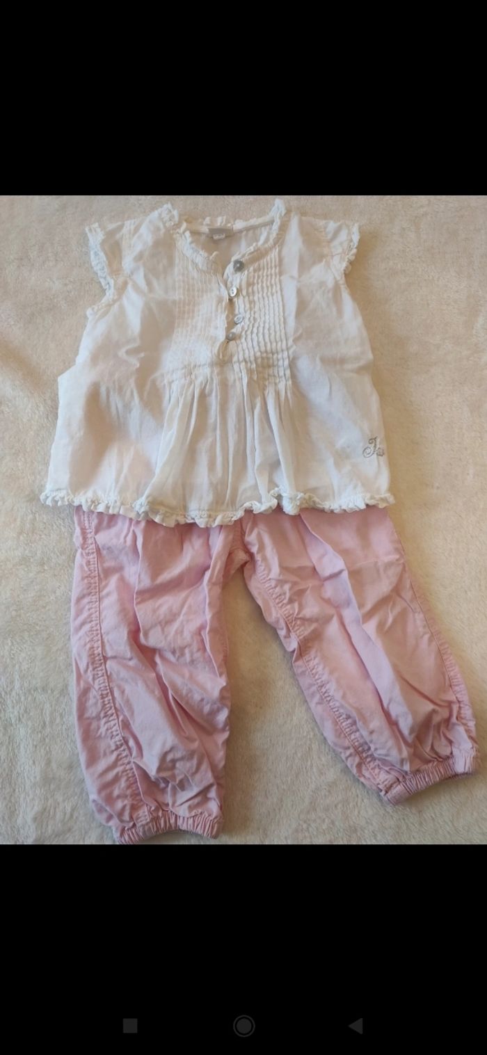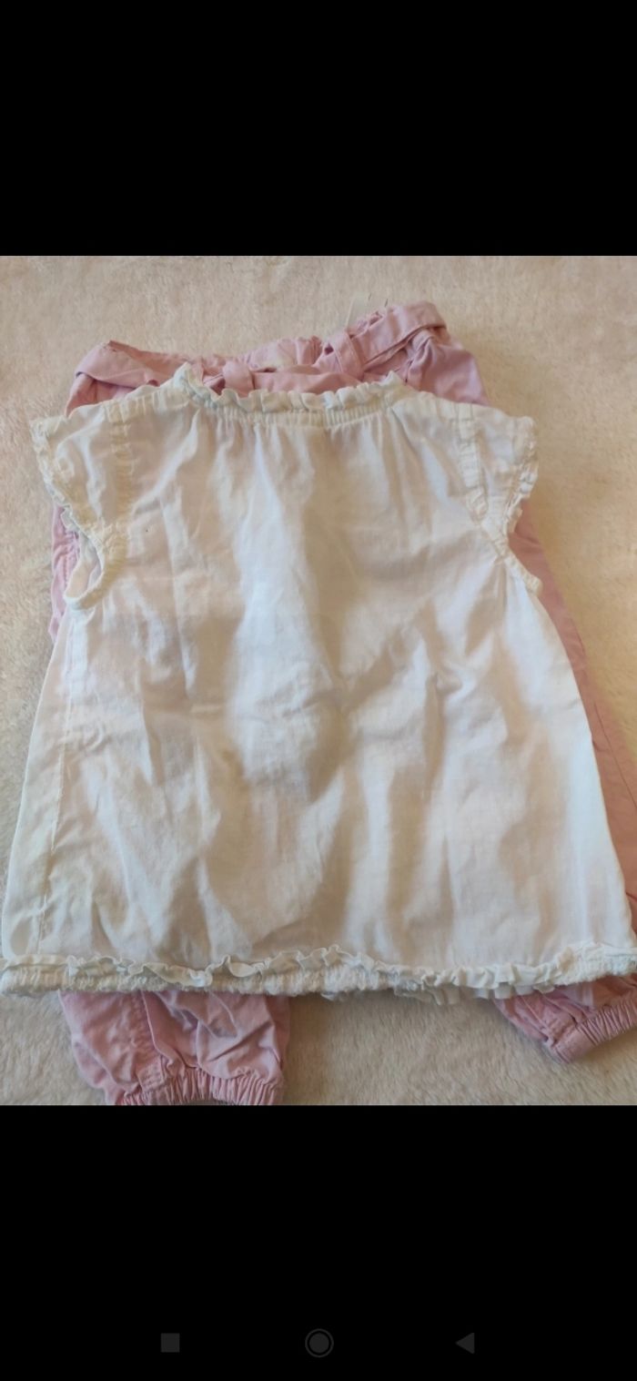Blouse blanche sans manche. Boutons à l'avant. Un peu jauni au niveau des boutons. Pantalon rose avec ceinture. Élastique réglable à la taille.