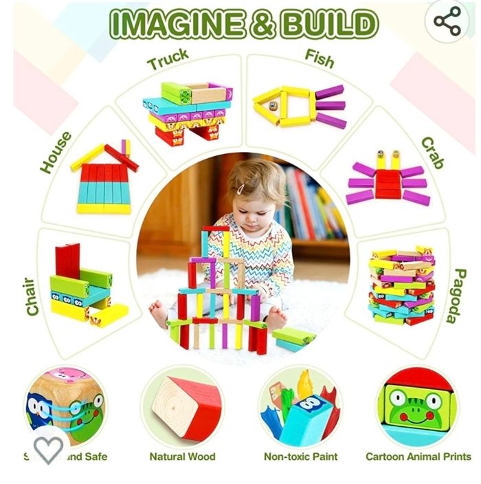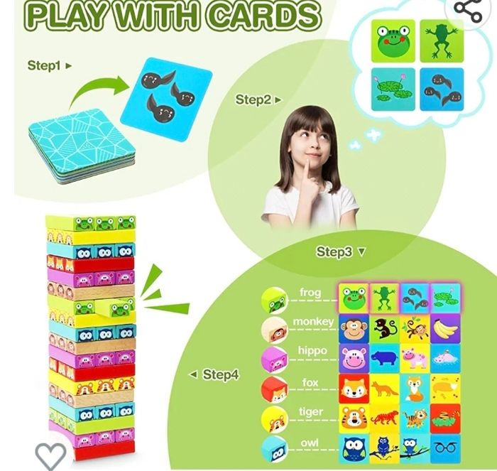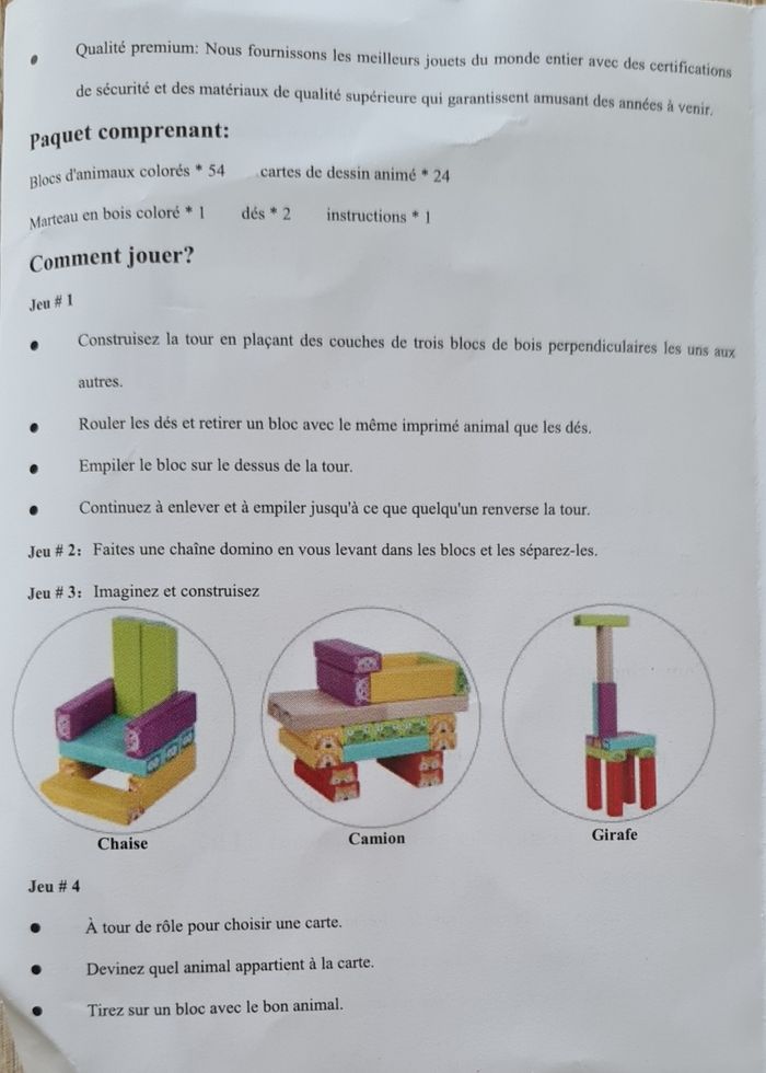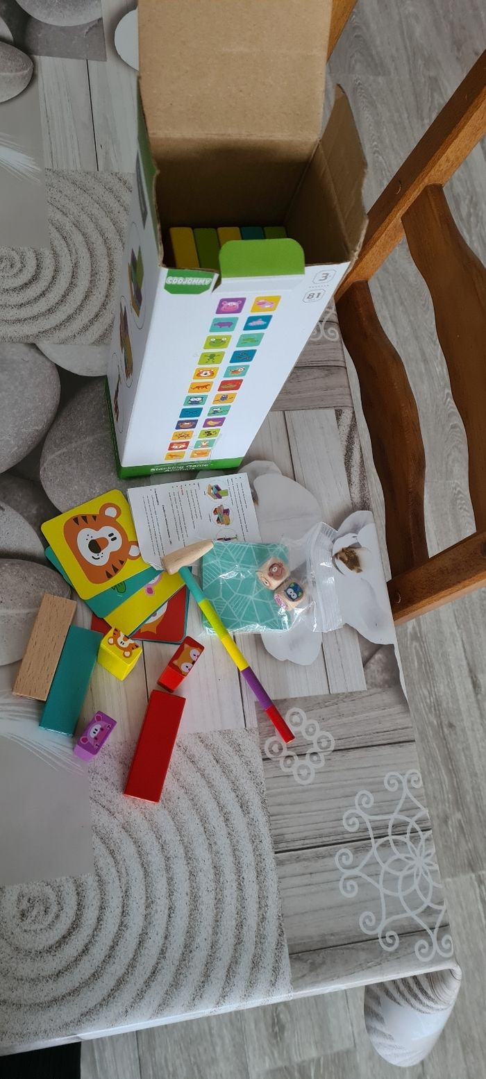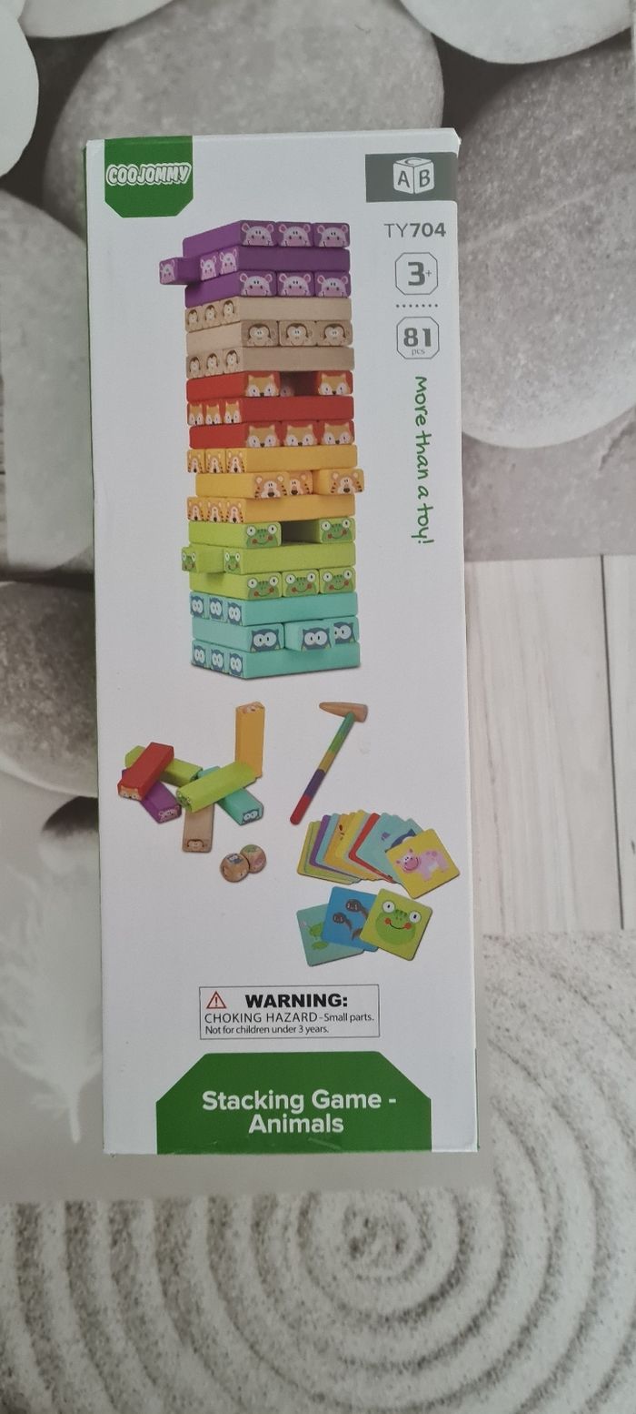 ENVOI UNIQUEMENT PAR MONDIAL RELAY. Ce jeu a servi 2 fois pour un temps bien court, mes petites-filles n'aiment pas. C'est une tour de bloc chancelante, animaux et couleurs. Ce jeu est complet avec la notice, 81 pièces en bois en excellent état, pas d'éclat ni de rayure, de 3 à 9 ans.