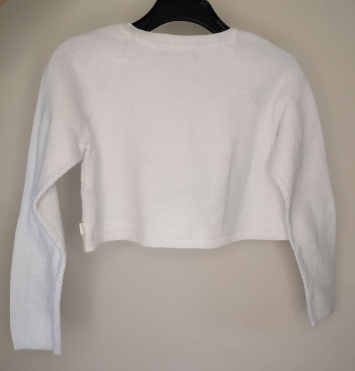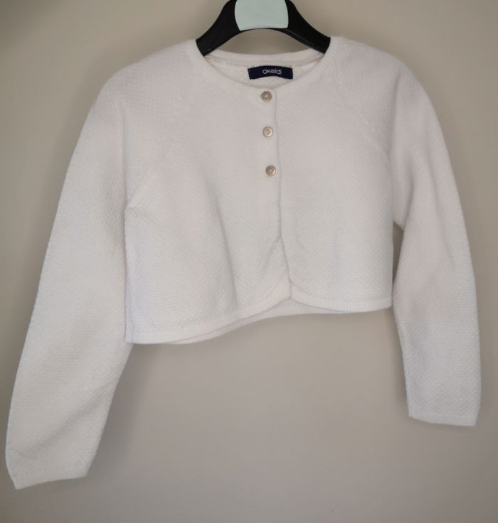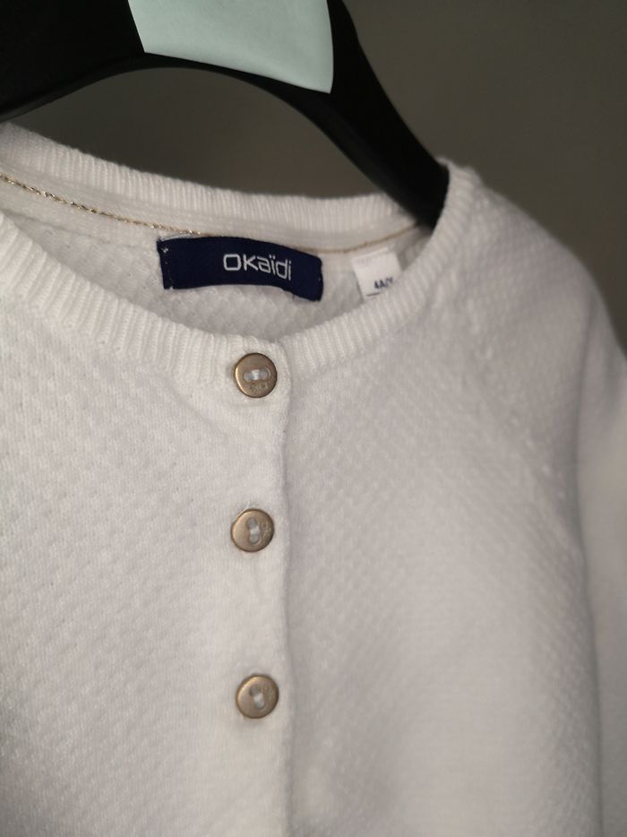 Gilet manches longues blanc avec boutons. Marque "Okaïdi", taille 4 ans. Très bon état.