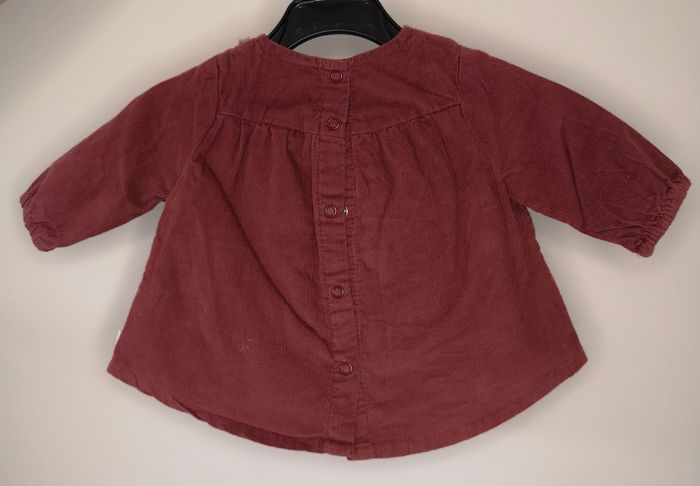 Blouse velours, boutons chats, pressions à l'arrière. Marque "Tape à l'œil", taille 1 mois. Très bon état.