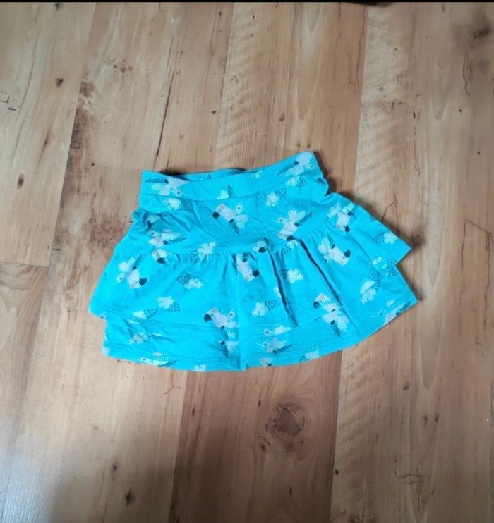 Jupe 5-6 ans couleur turquoise avec motif perroquet mauve. Marque tex