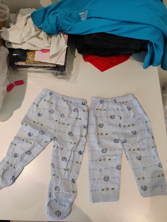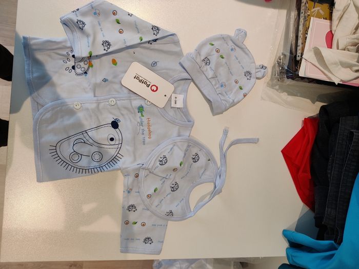 Ensemble comprenant : 1 bavoir, 1 bonnet, 1 gilet, 2 pantalons (un sans pied/un avec pieds) Jamais porté