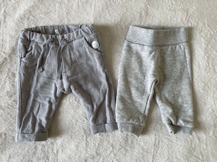 Lot de 2 pantalons gris de la marque Esprit (petit pantalon de jogging à droite) et Boboli (pantalon de gauche) taille 1 mois En très bon état