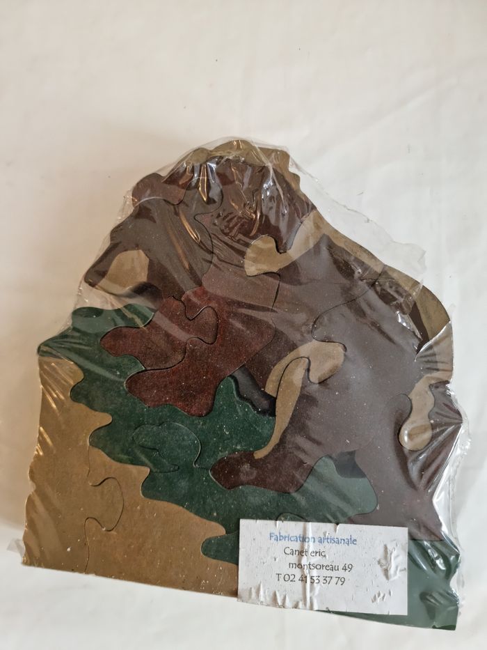 Puzzle en bois Puzzle en bois massif, très épais (environ 3 cm d'épaisseur) Fabrication artisanale. Par Mr Canet, à Montsoreau, en Pays de Loire. Peint à la main avec peinture alimentaire, sans risque pour les enfants. Fait à la main, le puzzle est unique et découpé à la scie à chantourner. Puis il faut soigneusement poncer chaque pièce. Ensuite les pièces ont été peintes pour donner ce très beau puzzle. Jeu neuf sous emballage, 12 pièces Puzzle représentant un magnifique ours gravissant la montagne.