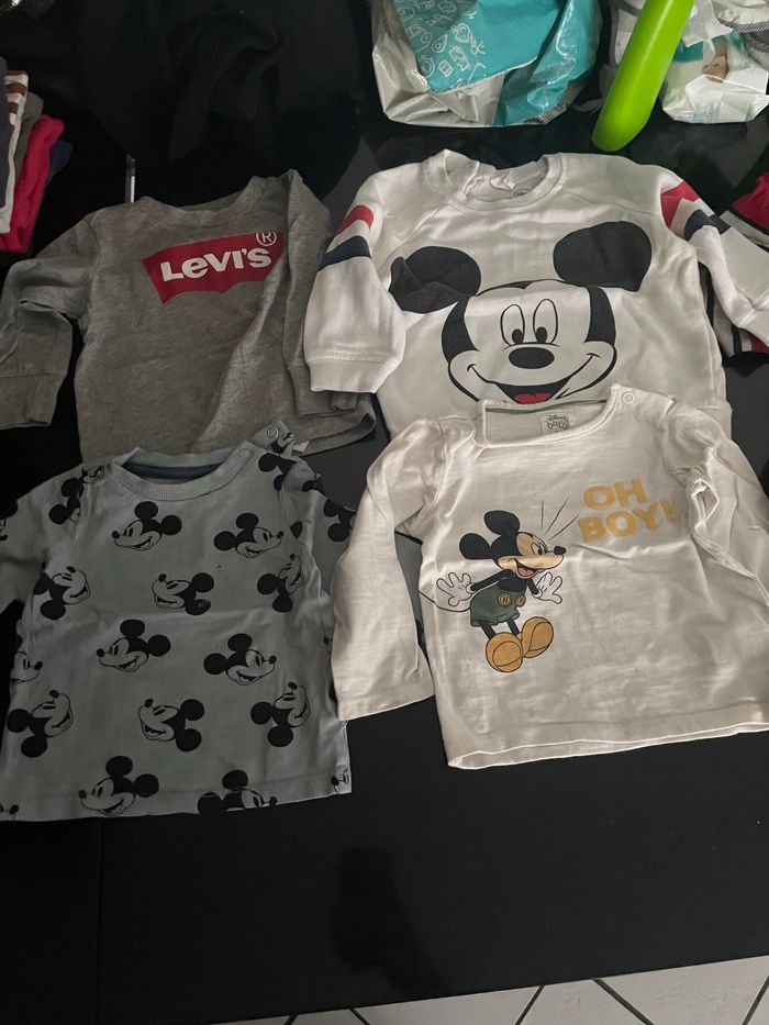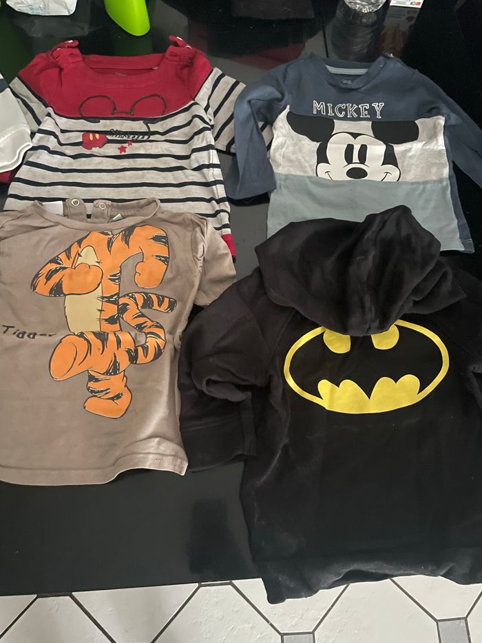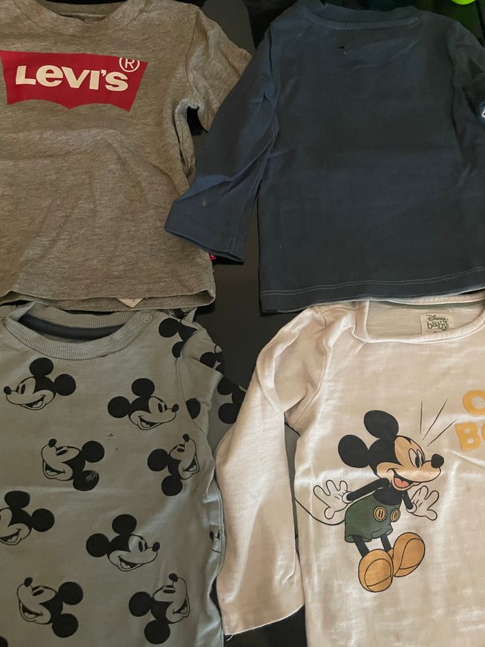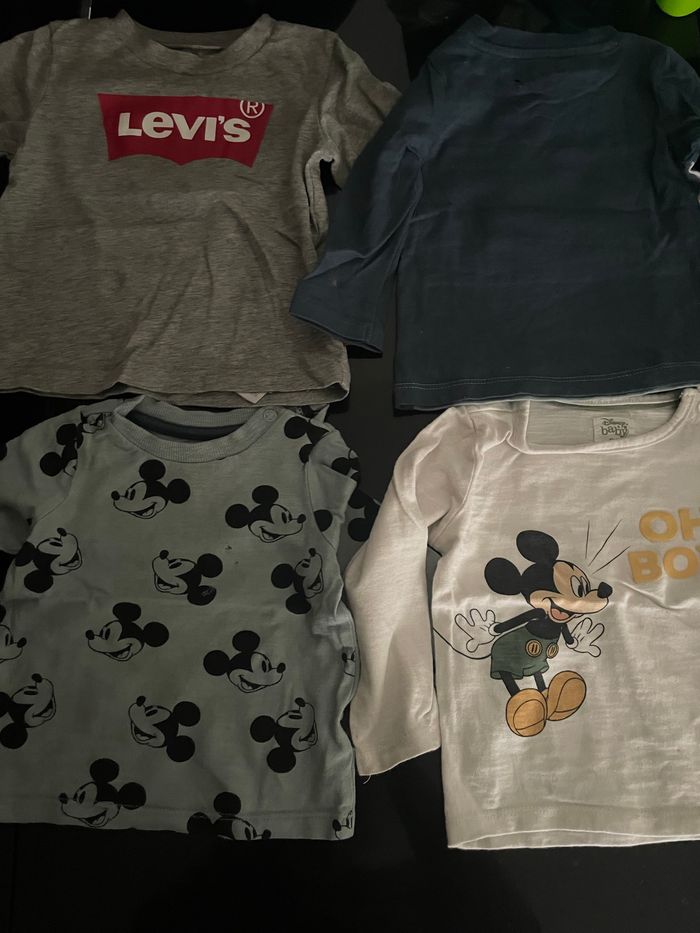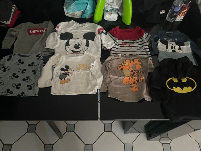 Bonjour, Je vends un lot de 8 t-shirts à manches longue Taille 12mois. Voir sur les dernières photos pour taches et petits trous. Disney, Levis et Marvel En bon état.