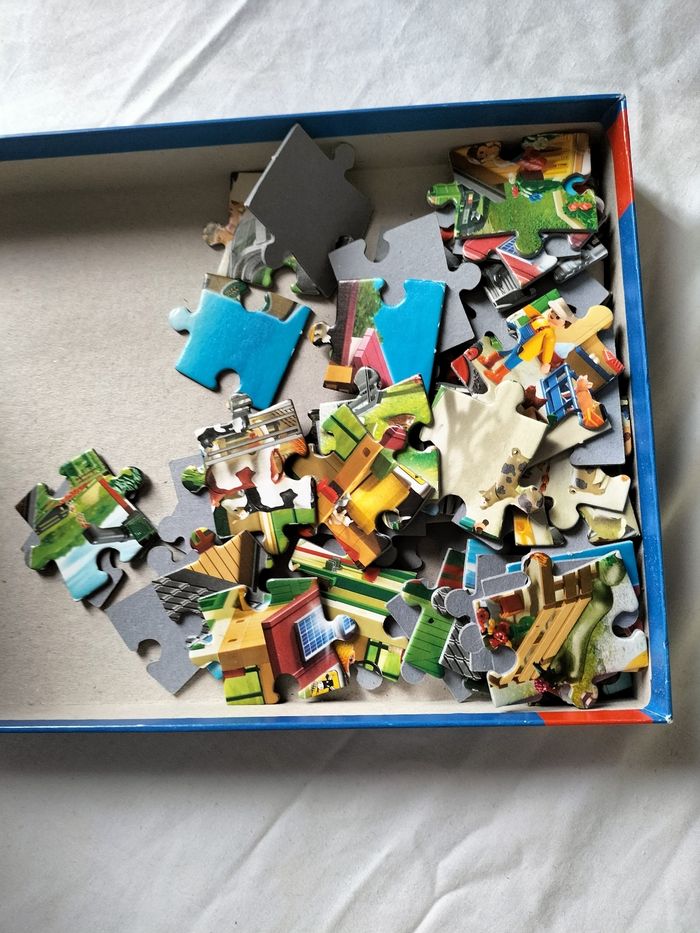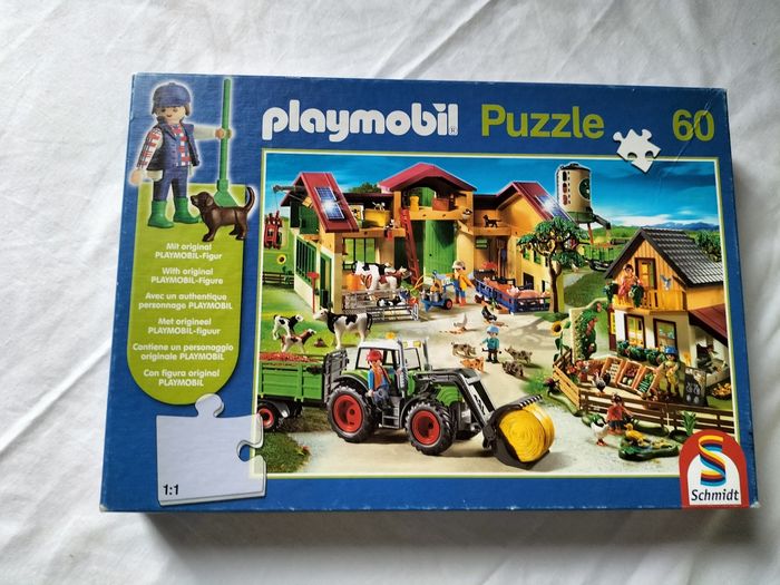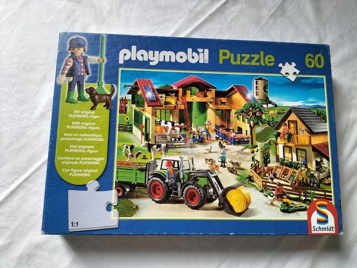 Puzzle playmobil sans la figurine quelques pièces abîmées mais cela n'empêche pas de faire le puzzle et la boite est un peu pliée J'ajoute les photos du puzzle fait demain car aujourdui je n'ai pas eu le temps de le faire