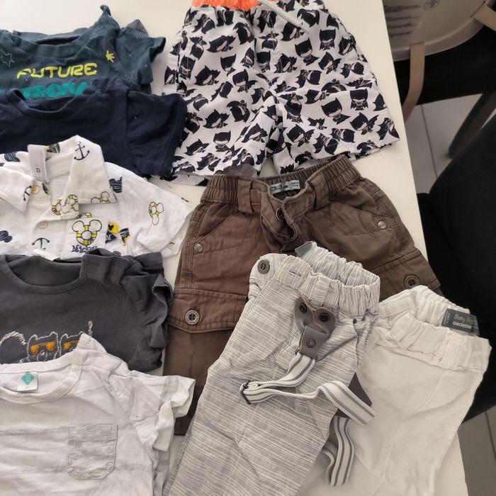 Lot vêtements été garçon taille 12 mois. Tee shit manches courtes, pantalons légers, maillot de bain batman. Marques diverses... Bon état général