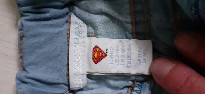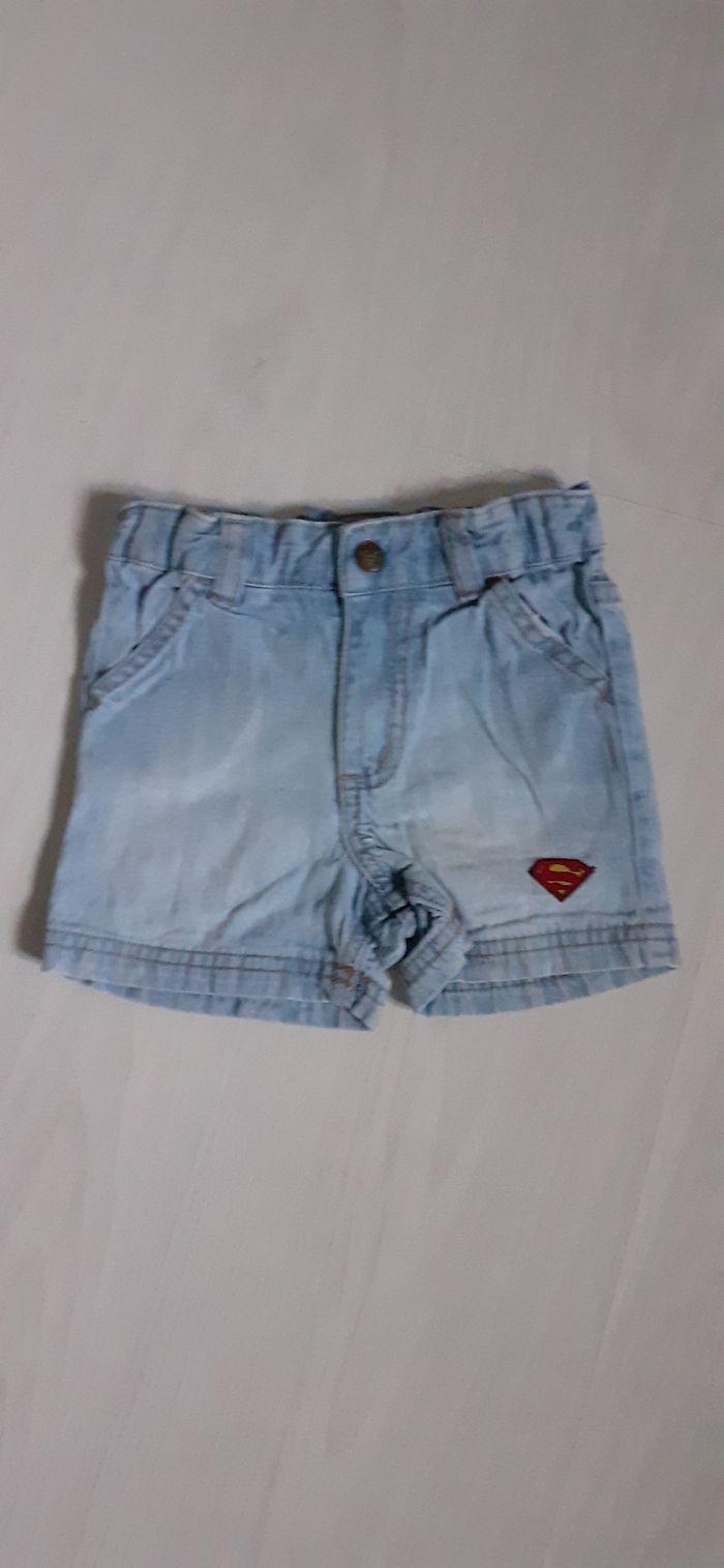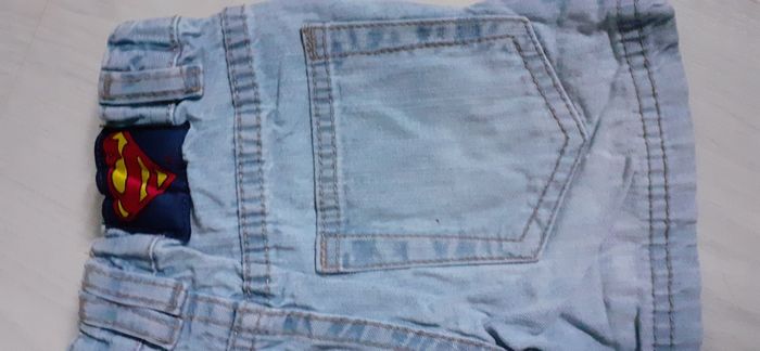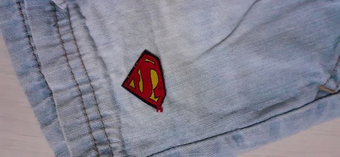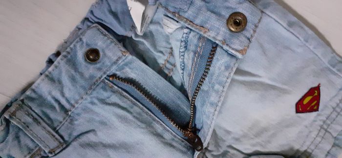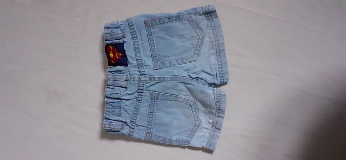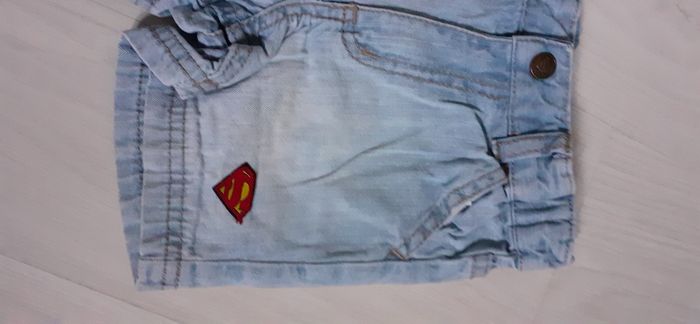 Short jeans T 2/4 mois Marque H&M Couleur bleu clair 2 poches devant 2 poches arrière Passants pour ceinture Attache fermeture éclair et pression Logo Superman sur bas de jambe gauche et taille arrière Possibilité de réglage de la taille ( voir photo) Très très bon état