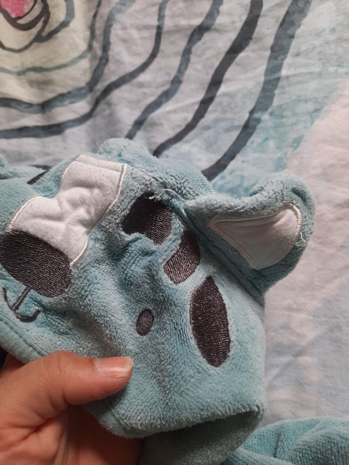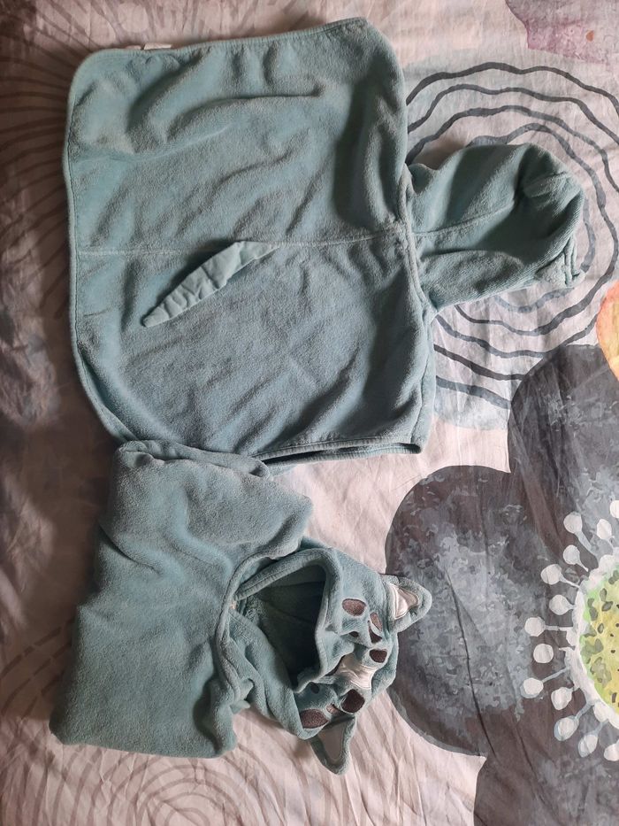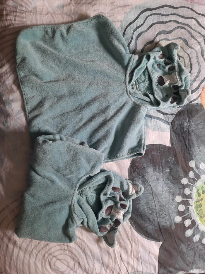2 capes ,en bon état, il y a juste un file qui sort sur l'une d'elle (voir la photo) Il est marqué taille unique mais dirais 9/18mois.