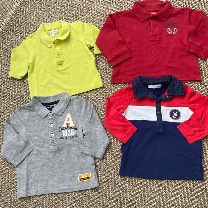 Je vend un lot de 4 polo manche longue il y a 1 kiabi , 1 kitchoun. 1 tissaia et 1 mes petit cailloux taille 9 mois en tres bonne etat