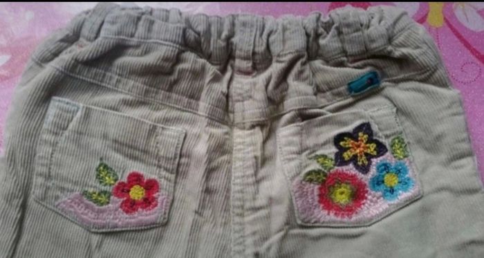 Pantalon doublé en velours avec des petits détails fantaisies brodés sur le devant et ds le dos. Taille ajustable