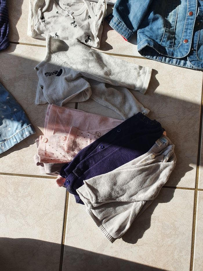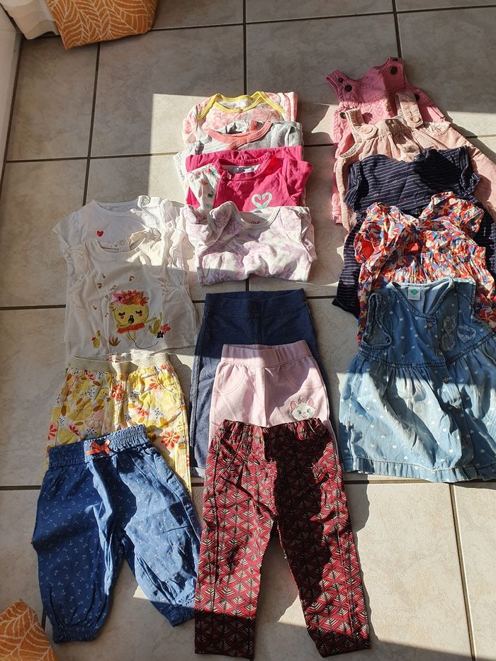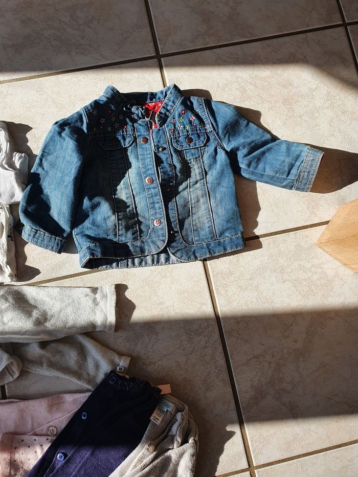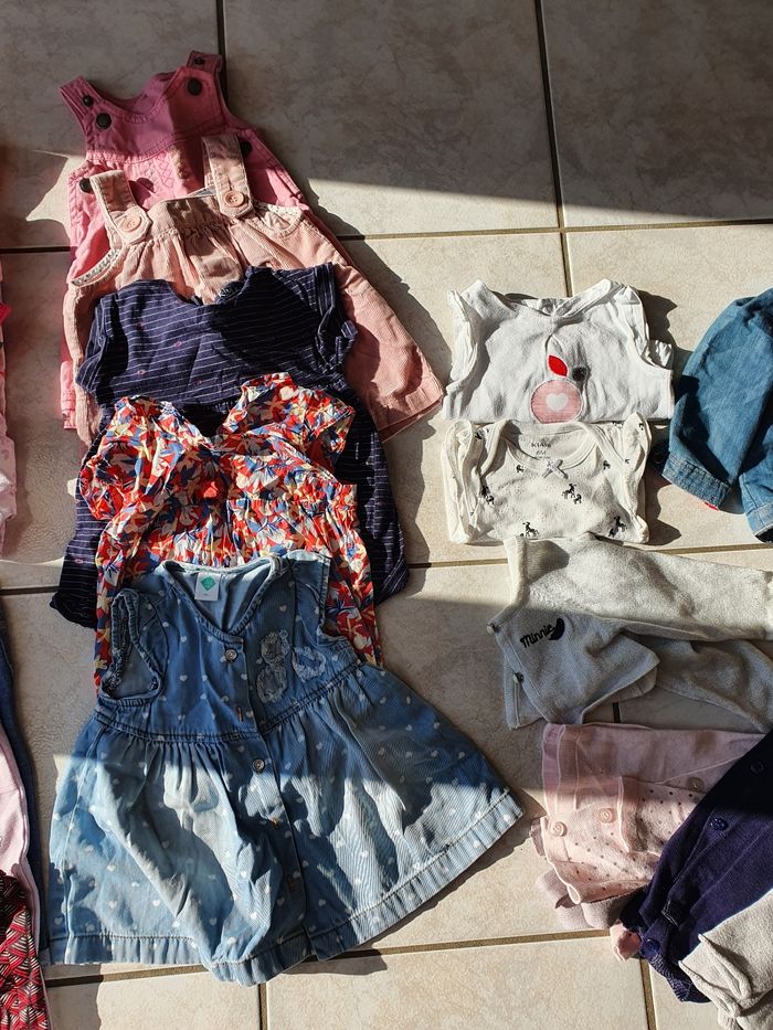 Lot printemps été 6 mois comprenant : 2 tee shirts manches courtes 2 bodies manches courtes 4 pyjamas en coton 4 robes 1 combinaison 4 vestes en tissus 1 veste en jean 5 pantalons léger Total de 23 articles, tous en très bon état Mélange de marque : DPAM, TAO, orchestra, kiabi, okaidi