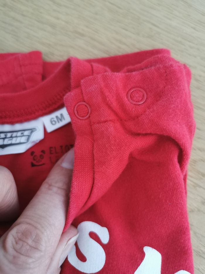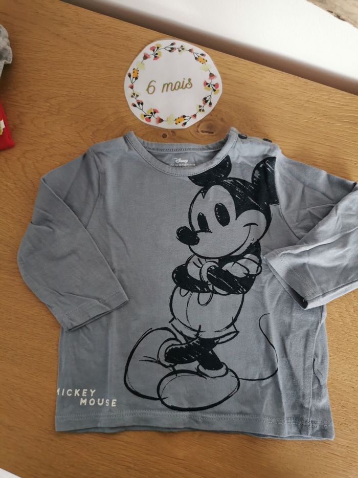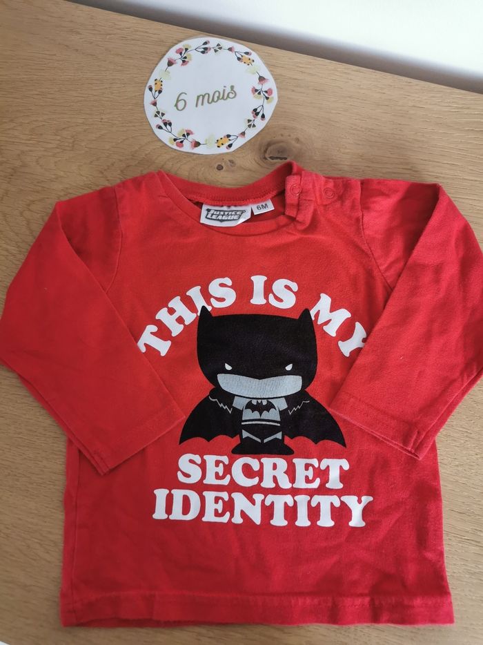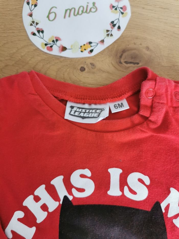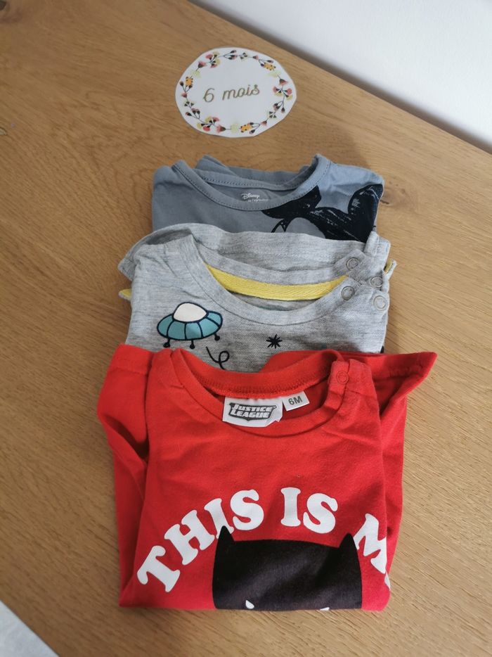 Lot de 3 t-shirts bébé 6mois manches longues ✅ Tshirt mickey kiabi neuf seulement lavé ✅Tshirt rouge batman justice league bon etat ni trou ni tache mais il a le nom de l'enfant tamponné ✅Tshirt gris dinausaures in extenso en très bon état. Le nom de l'enfant est également tamponné dans celui-ci