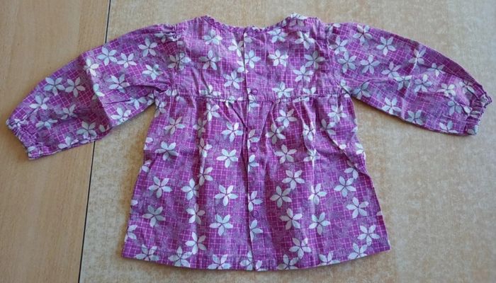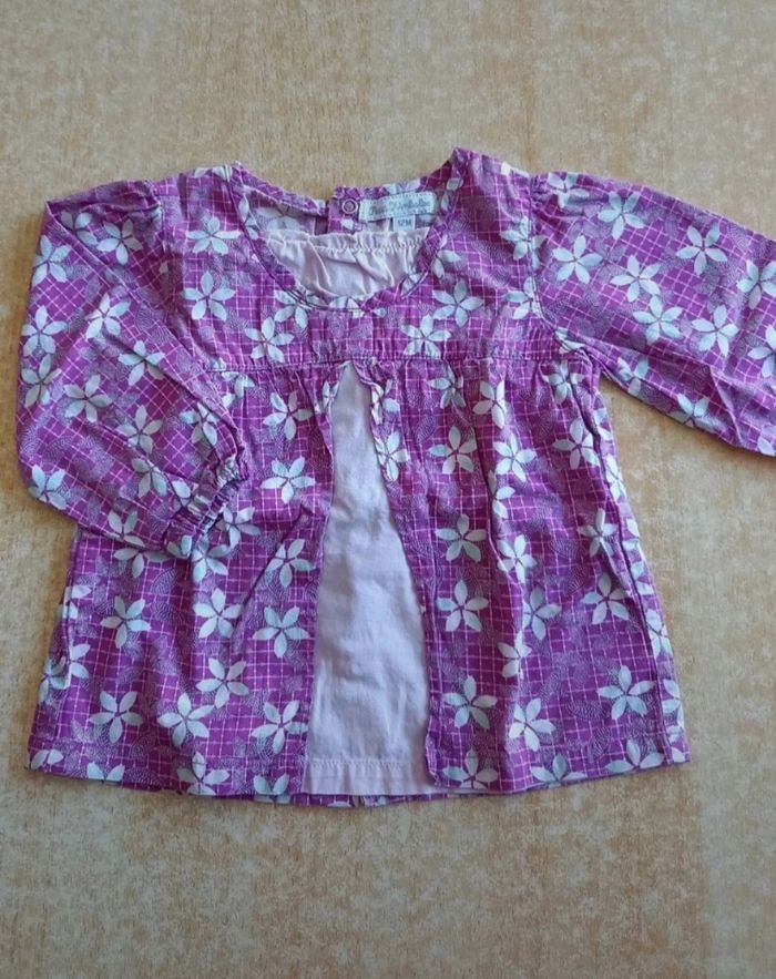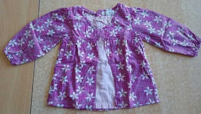 Blouse violet/rose, pressions au dos. En parfait état. Taille 12 mois.