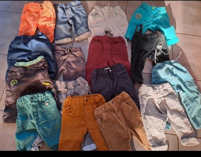 Lot 6 mois garçon 3 short 1 salopette short 1 combishort 7 haut été 16 pantalons 9 gilet 1 pull 3 boléro 15 pyjamas 1 peignoir 8 bodies 19 t shirt manche longue 5 chemises Toutes marques , beaucoup de okaidi tape à l'œil