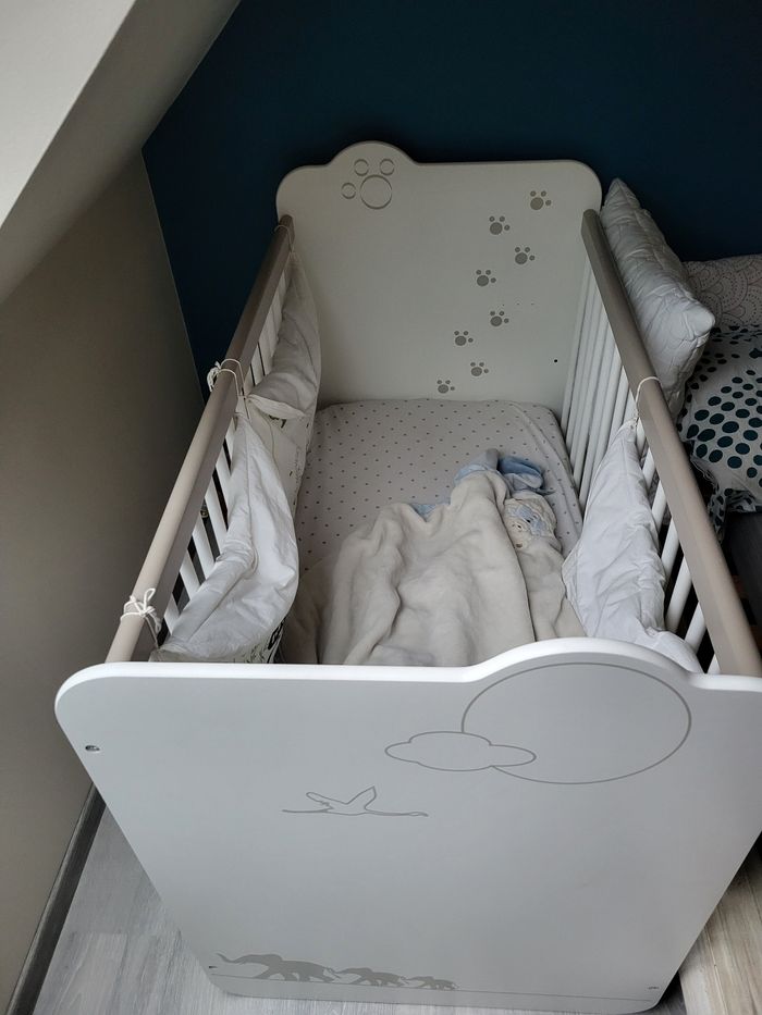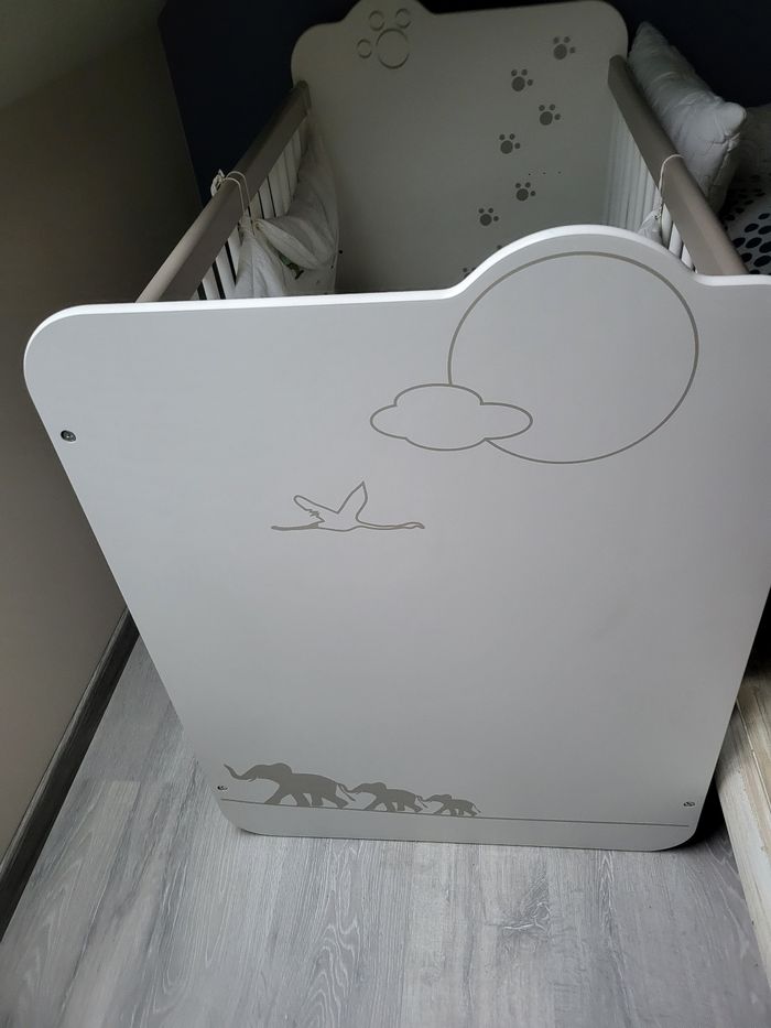 Lit bébé tout neuf blanc et éléphant oiseaux beige