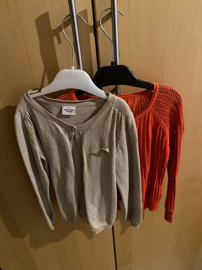 Vend 1 lot de 2 gilets marque tape à l’œil , taille 5 ans / 110 cm . 1 rouge et 1 doré