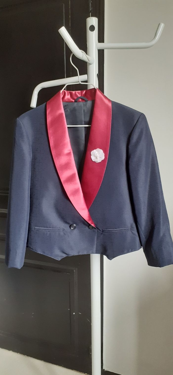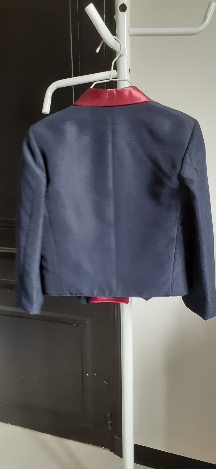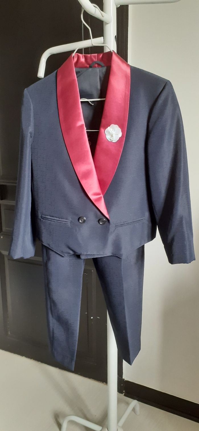 Costume T 6 ans Couleur bleu marine et bordeaux Pantalon : Attache bouton et fermeture éclair/ passants pour ceinture et 2 poches devant Veste : 2 poches devant/ manches longues/ col de couleur bordeaux satiné avec broche blanche et attache bouton Quasi neuf porté maximum 3 heures