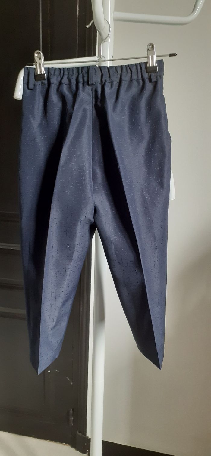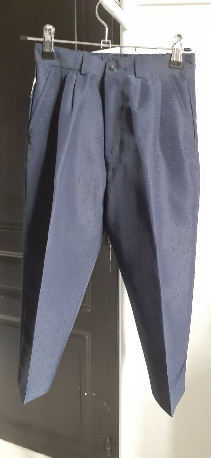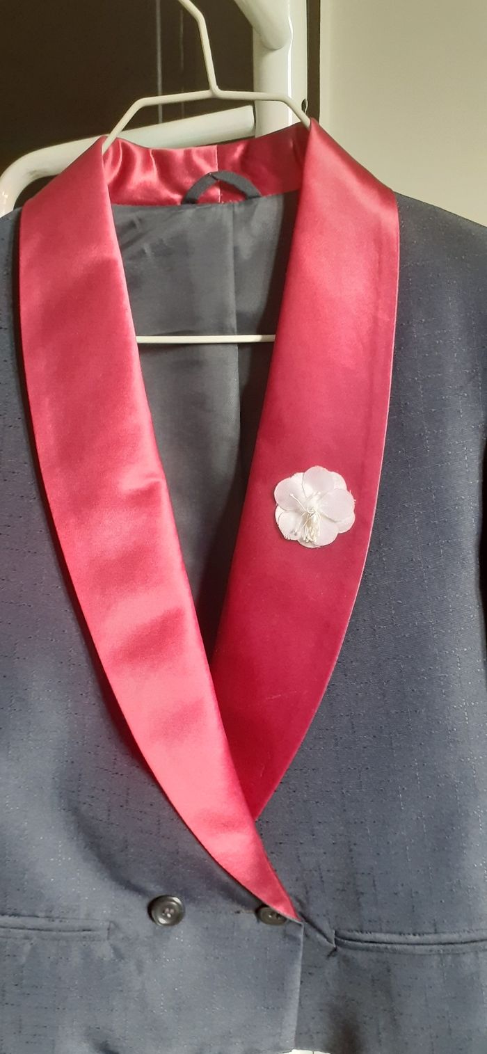 Costume T 6 ans Couleur bleu marine et bordeaux Pantalon : Attache bouton et fermeture éclair/ passants pour ceinture et 2 poches devant Veste : 2 poches devant/ manches longues/ col de couleur bordeaux satiné avec broche blanche et attache bouton Quasi neuf porté maximum 3 heures