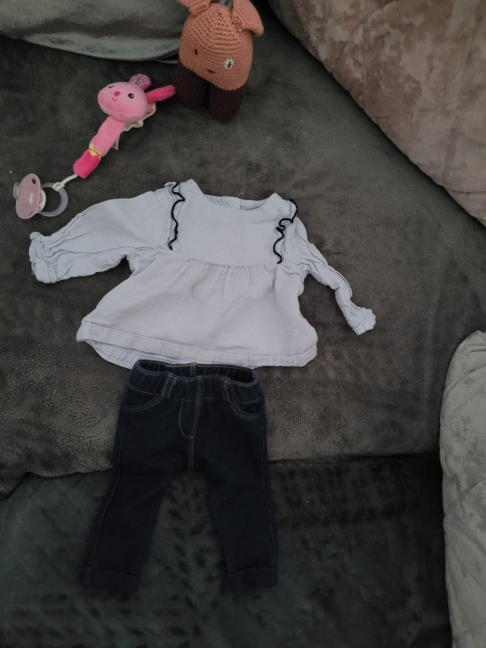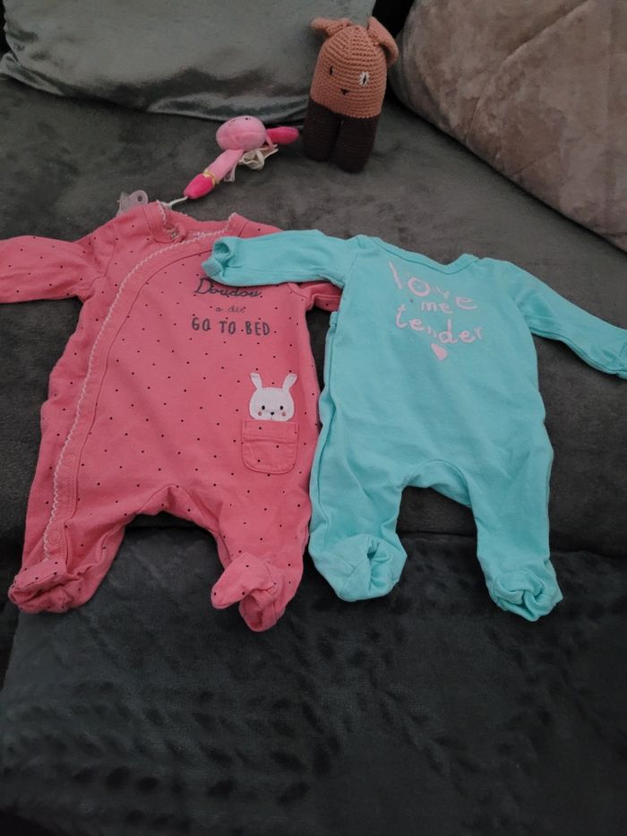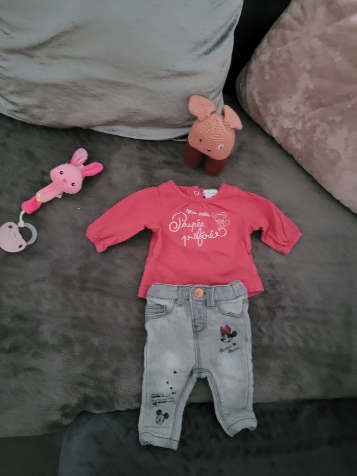 A vendre lot 1 mois 1 jeans disney 1 tee shirt 1 robe kiabi 1 tunique kiabi 1 jeans kiabi 1 robe et culotte kiabi 2 pyjama 2 body Le lot à 3 euro 50