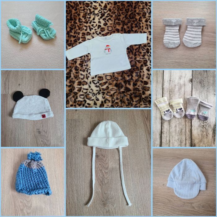 Lot naissance garçon 1 tee-shirt manche longue 3 bonnets 1 paire de chausson 1 casquette 3 paires de chaussettes