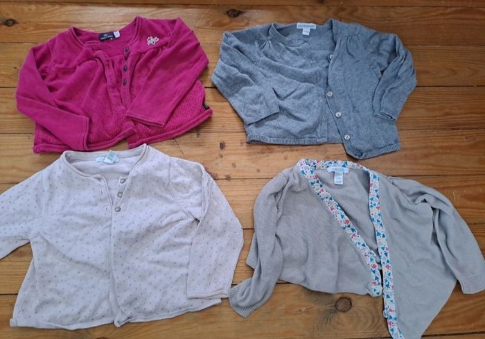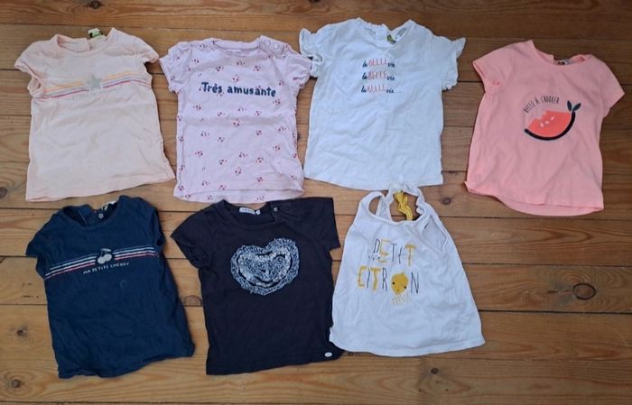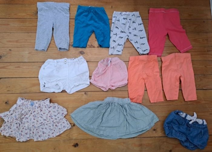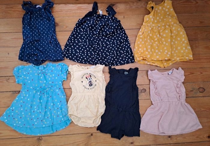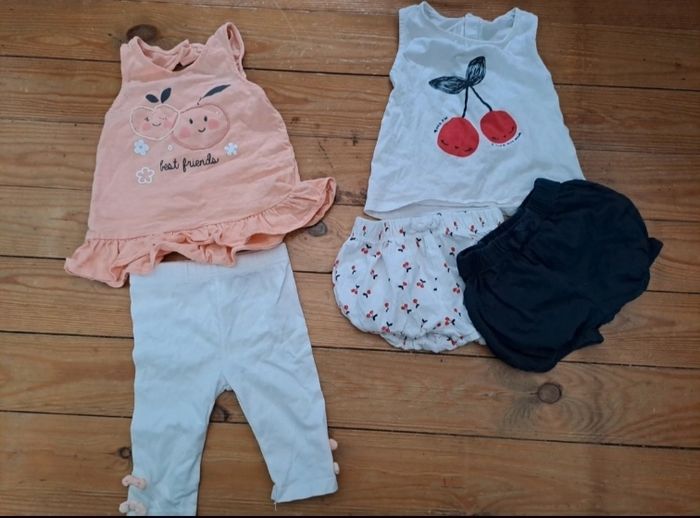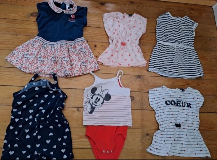 Lot 18 mois été 7 t shirt 6 robes 4 combishort 1 bodies t shirt 2 tuniques 4 gilet 2 ensemble 6 leggings court (2 ont une petite taches) 2 jupes 3 short