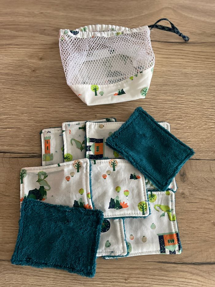 Lot de 10 lingettes lavables avec un filet de rangement et de lavage Faites main Un côté tout doux et un côté avec motif dragon et châteaux forts Pour le change de bébé ou le débarbouillage ou encore le bain. Passe en machine et au sèche linge