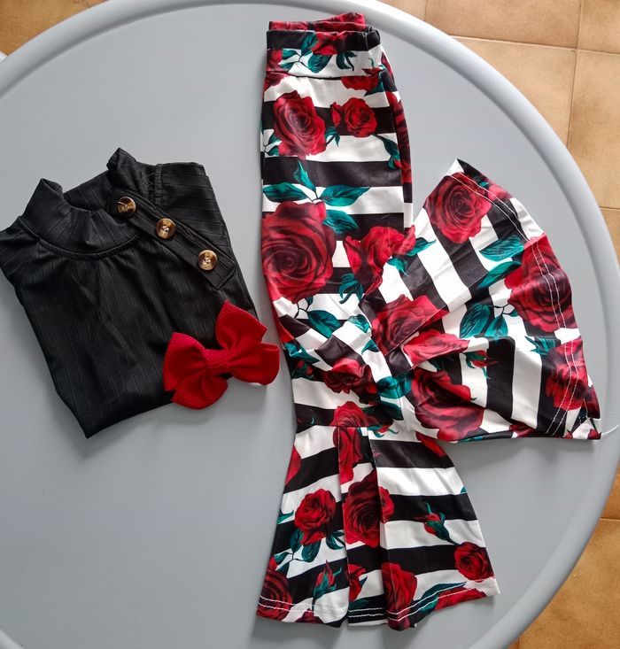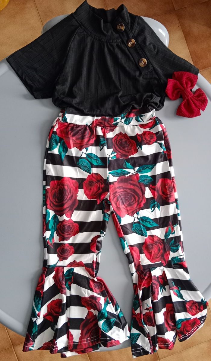 Ensemble pantalon patte d'eph rayé à grosses roses rouges, top noir et barrette gros noeud