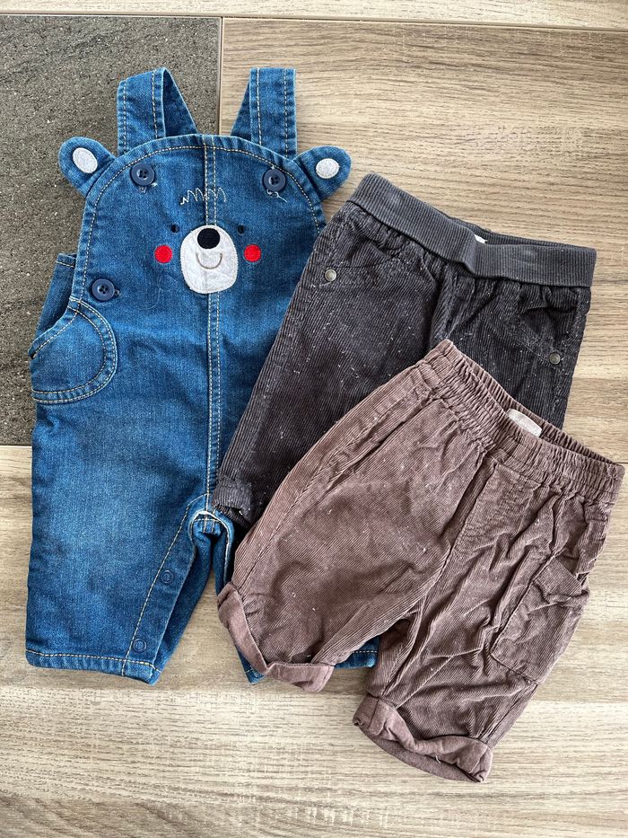 Salopette 1 mois et 2 pantalons en velours 1 mois (ce sont des peluches sur les pantalons que je vais retirer avant envoie)