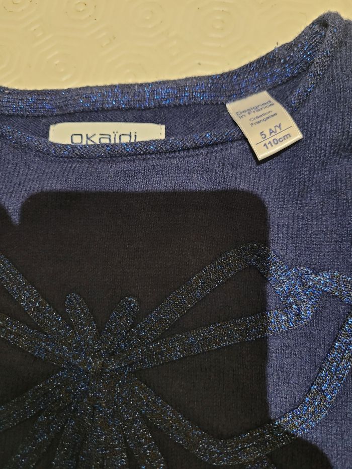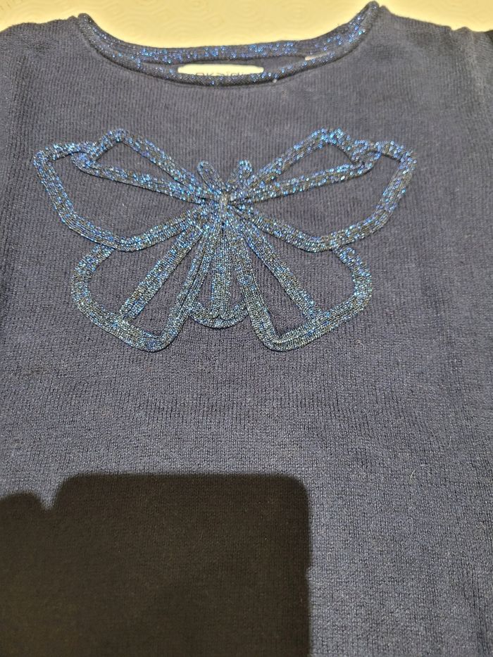 Pull fin manches longues. Bleu avec sequins bleus formant un papillon. Marque: Okaidi Taille : 5 ans