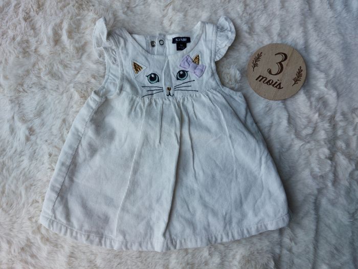 Magnifique petite robe blanche en côte de velours. Motif petit chat. Ouverture par pressions tout le long du dos, super pratique ! Très bon état. Marque Kiabi, taille 3 mois.