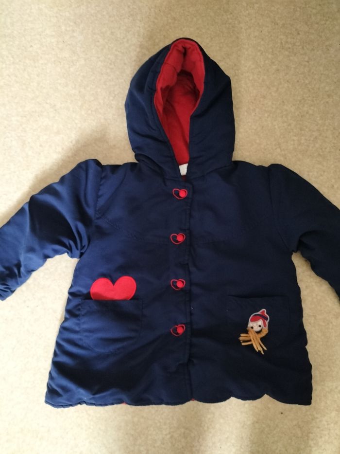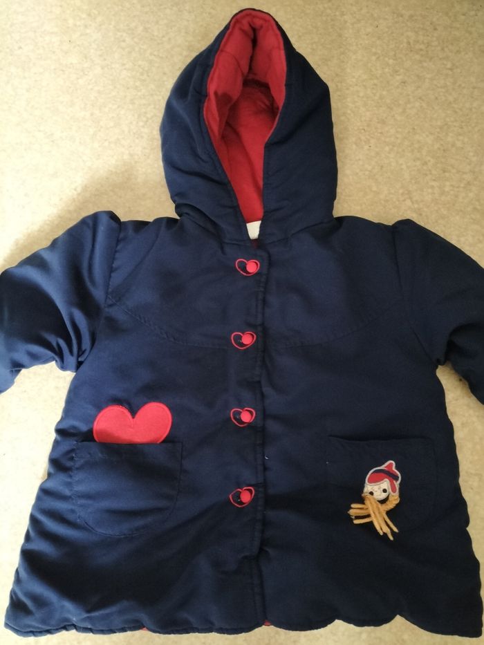 Manteau à capuche bébés Encore en très bon état Juste une petite marque blanche photo 3 Taille 9 mois Couleur bleu marine 5€