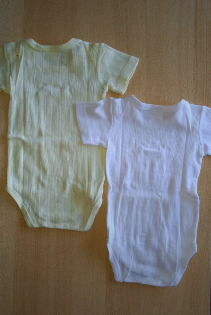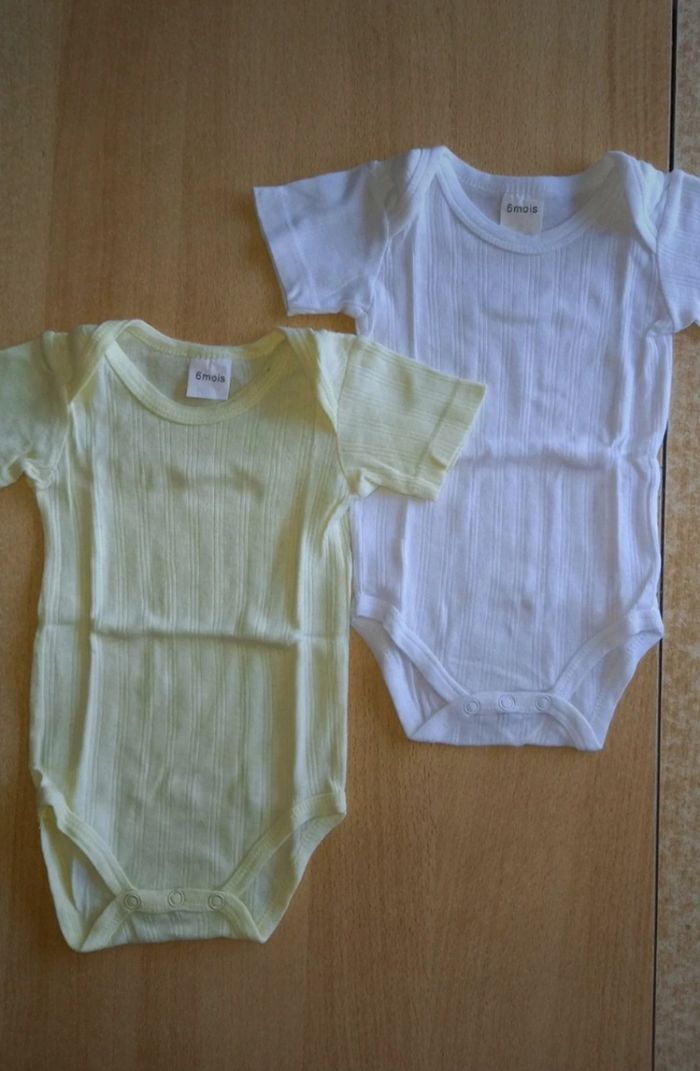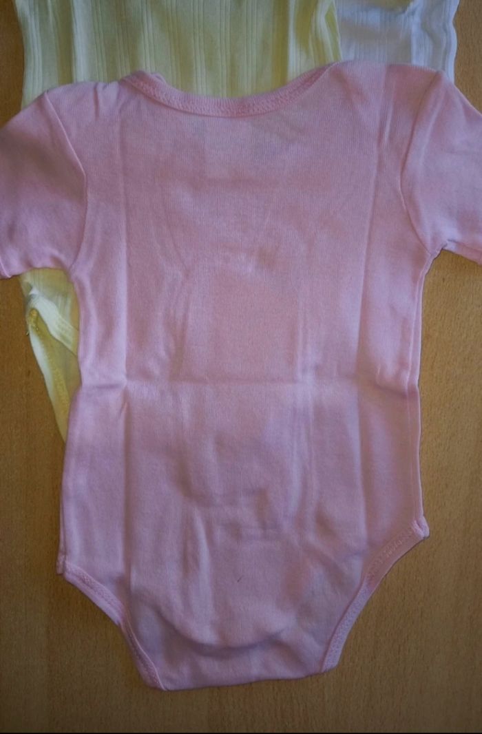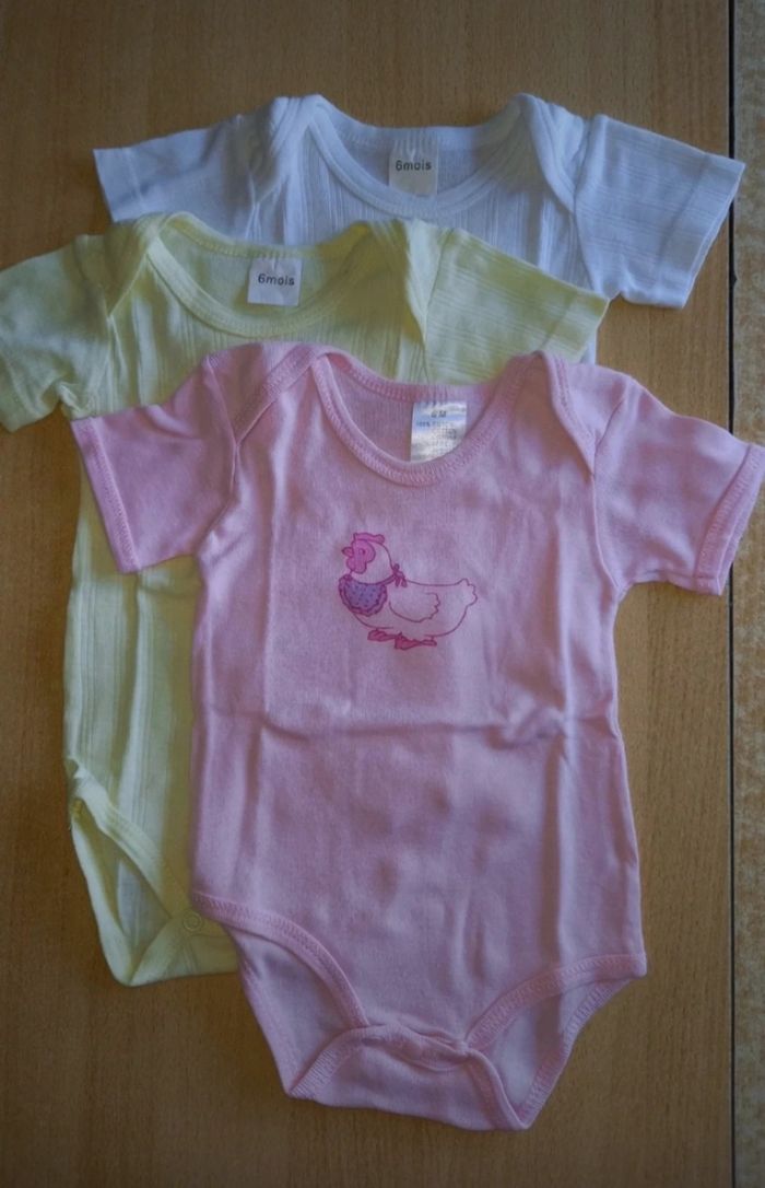Lot de 3 bodies à manches courtes, 1 rose, 1 jaune et 1 blanc. En très bon état. Taille 6 mois.