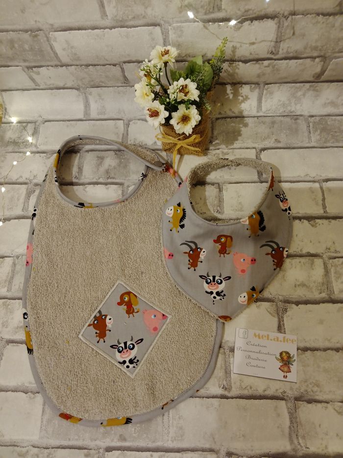 Grand format 8€ Bandana 3.5€ Les deux pour 11€ Multitude de tissu possible Broderie du prénom 0.5€