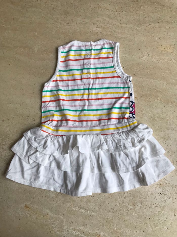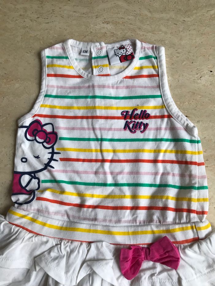 ROBE "HELLO KITTY" DE LA MARQUE "SANRIO" Coloris : Blanc et lignes multicolores pour le haut. Taille : 6 mois. Encolure arrondie. Fermeture par 3 pressions à l'arrière. 3 rangées de volants dans le bas avec un noeud rose fuchsia décoratif cousu sur le volant supérieur. Sans manches. Matière : Coton. D'occasion en très bon état (pas détachés, ni de trous ou d'accrocs).