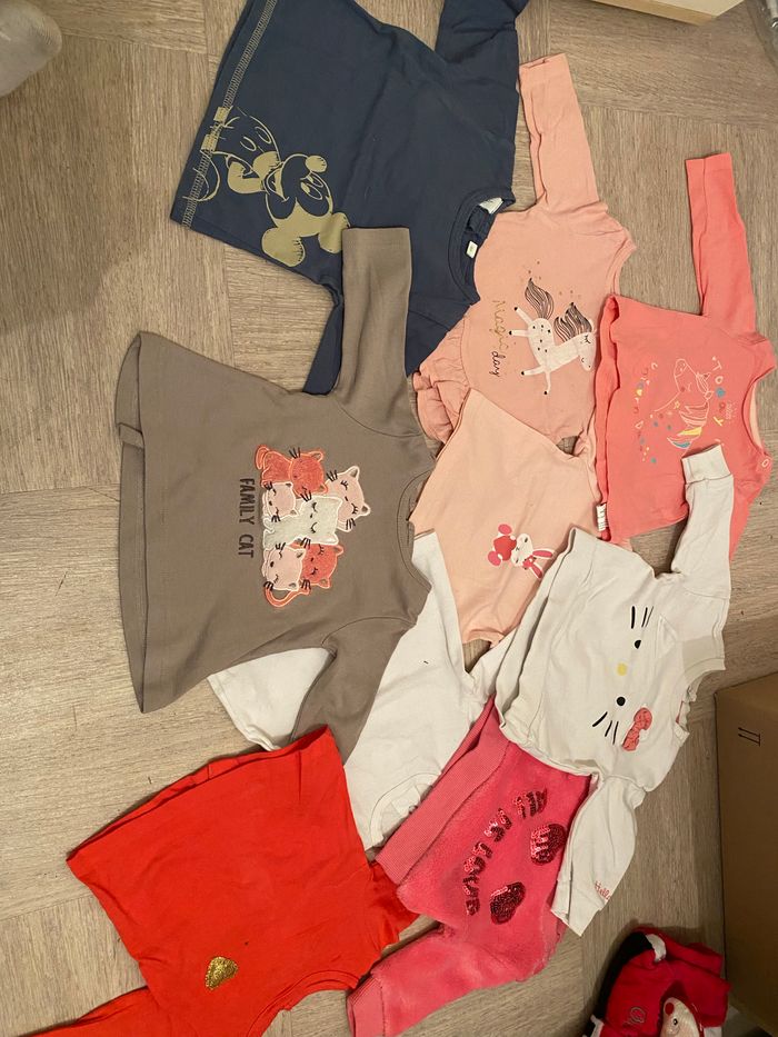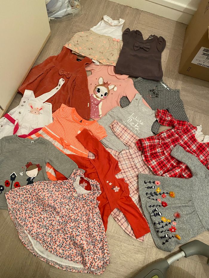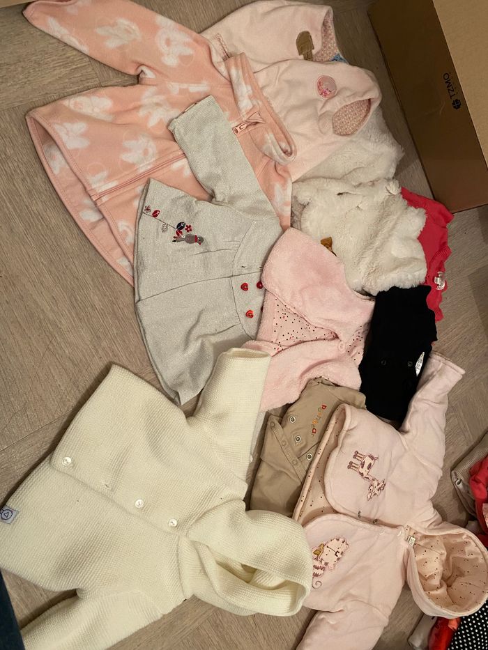 Je vend un carton de vêtement fille en taille 3 mois Robe Tee shirt Legging pantalon Collant Combinaison Gilet veste Le tout est à même pas 1 euros pièces. Tout est en très bon état.