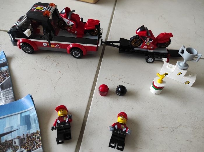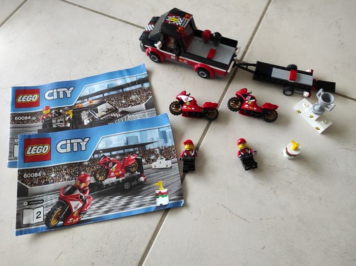 Lego transport de moto de course 60084. Notice et tout ce qu'il y a sur la photo ms je n'ai plus les boites. L'équipe de course à moto LEGO City se dirige vers le stade pour la course finale des championnats de moto ! Rejoins les as du pilotage à bord du transporteur de motos de course avec leurs motos ultra rapides. Lorsque tu arriveras au stade, aide à décharger les motos et dirige-toi vers le circuit. La foule est enthousiaste, cela va être une grande course ! Qui va monter sur la plus haute marche du podium pour soulever le trophée du championnat ? Comprend 2 figurines de pilote de course avec des accessoires assortis.