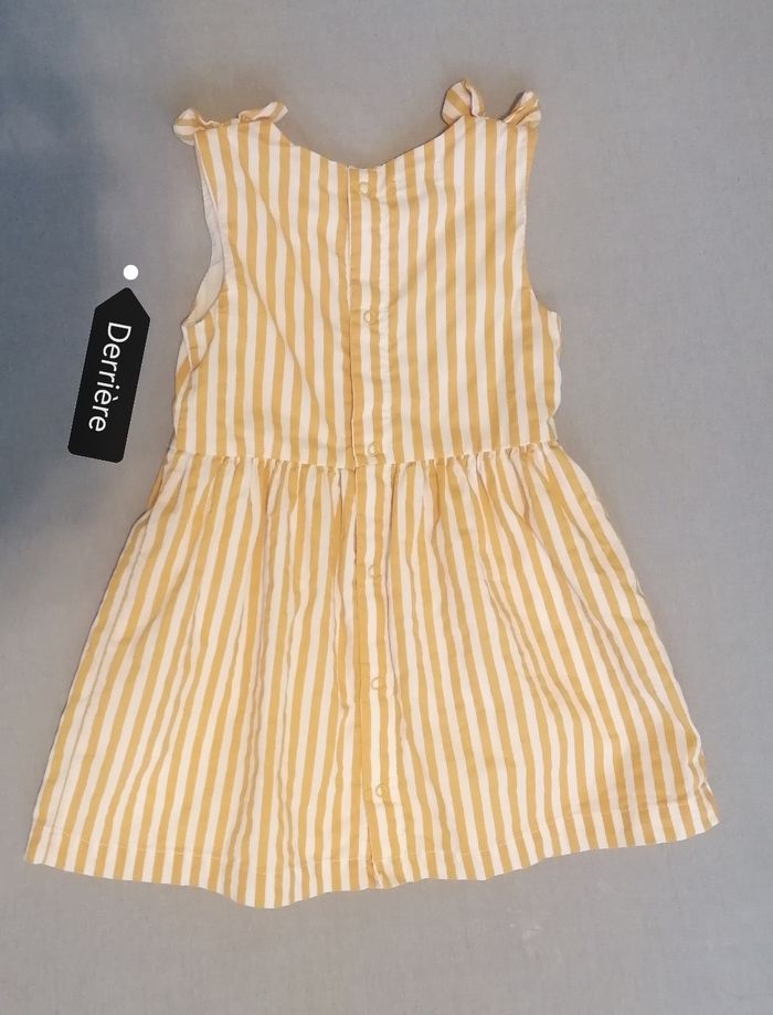 Robe fille kiabi. 18mois. 77/82cm Jaune /blanc. Manches débardeur. Ouverture la totale derrière des boutons clipse. Une doublure blanche. 100%coton. Juste essayer et laver. ( grande pour ma fille). 8€