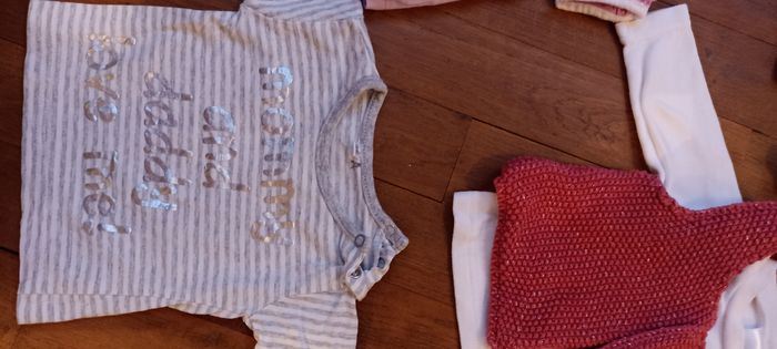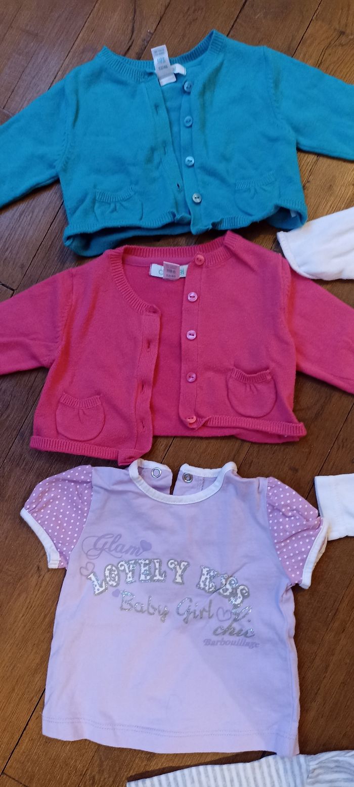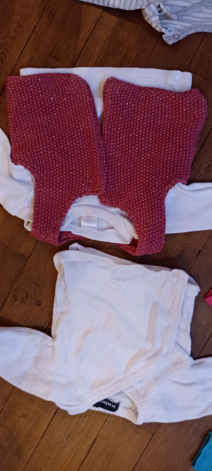 Lot comprenant 3 petits gilets ( un rose, un bleu et un blanc) marque obaidi et un extenso, un t-shirt manches courtes violet marque barbouillage et un manches longues gris, petit ensemble tee shirt blanc( marque baby club) manche longue et son gilet tape a l oeil neuf.